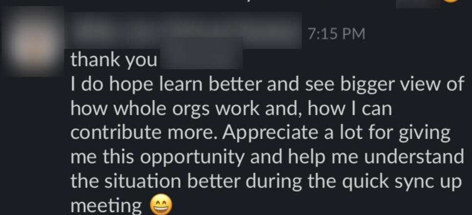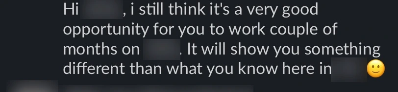 일단 이 팀에서 하는 일이 회사 입장에서 우선순위에 드는 프로젝트가 되는 건 맞으며, 그동안 미들웨어 역할을 하는 우리 팀에서, 나와 함께 팀을 이동하는 SDE2 엔지니어가 원한 것처럼 더 직접적으로 고객과 일할 수 있는 경험이 될 수도 있다는 측면을 덧붙여 설명해 줬다.