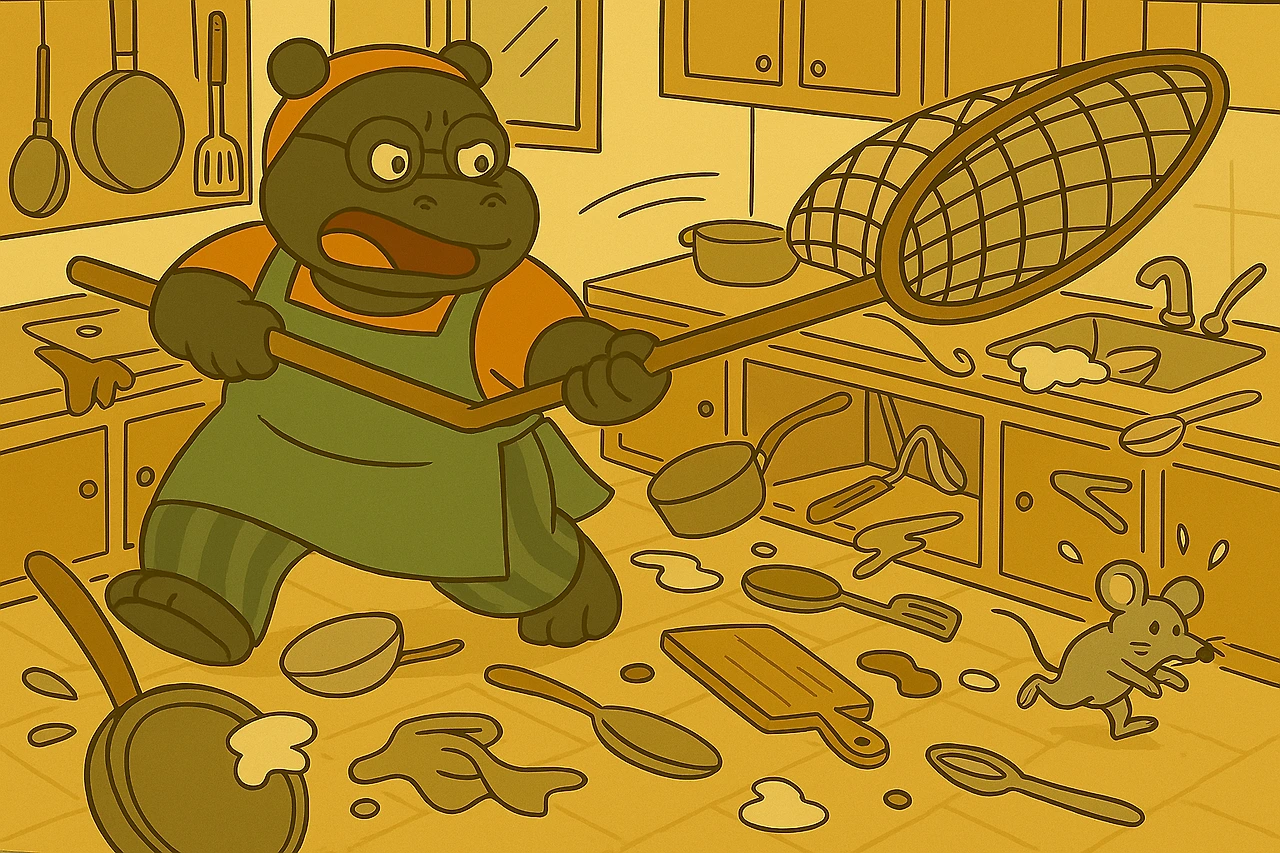 하지만 쥐는 냄비 사이로 쏙쏙쏙 빠져나갔어요.