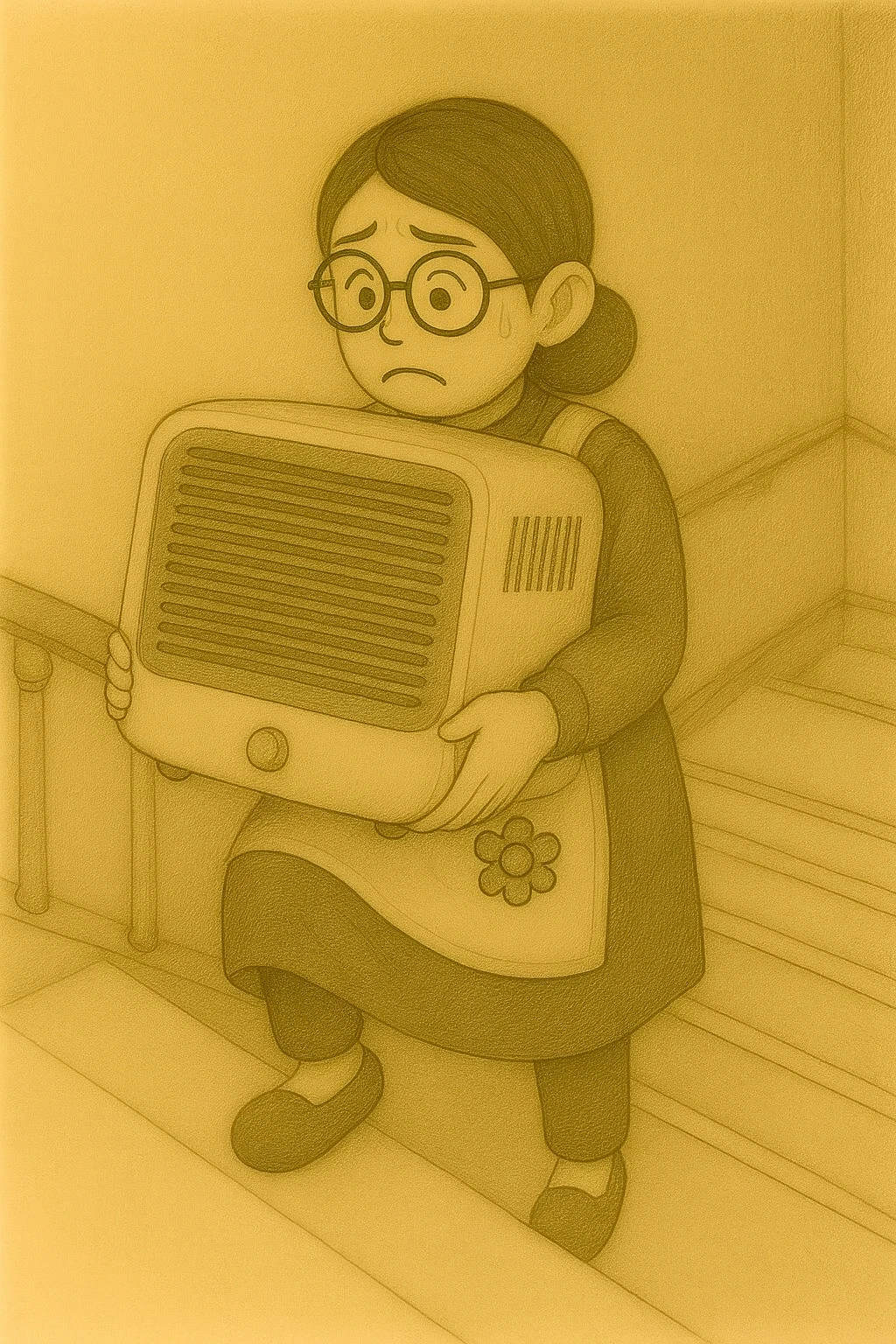 혼자 히터를 들고 계단을 오르며,