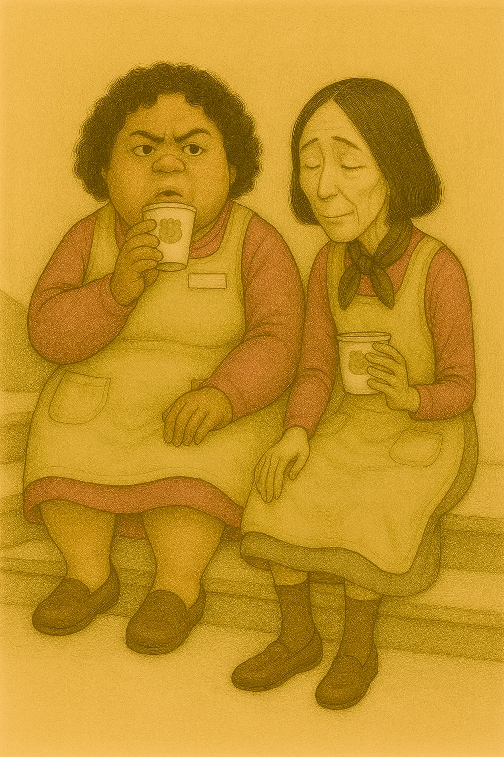 커피를 마시며, 교실에서 쉬고 있는 그들의 모습.