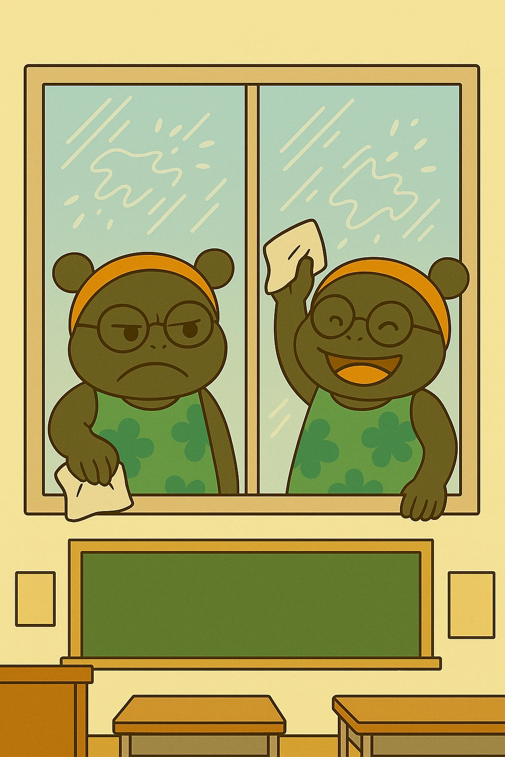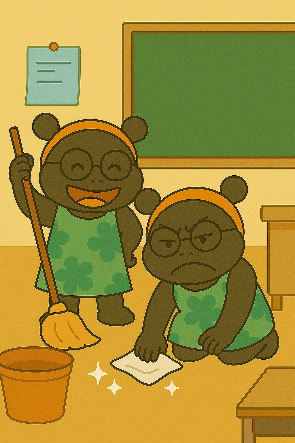 교실 구석구석을 엔젤 선생님과 몬스터 선생님이 함께 청소합니다.