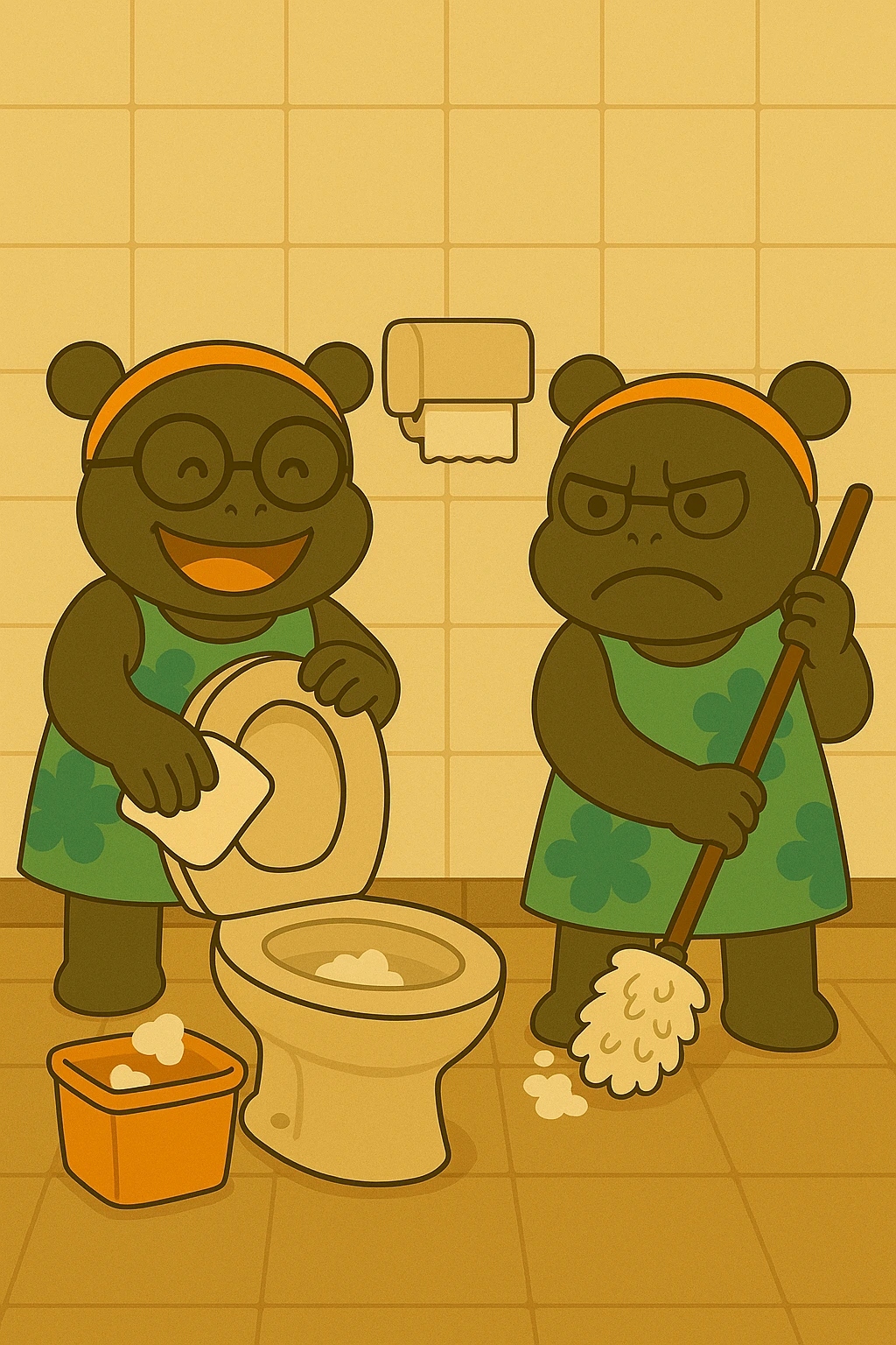 몬스터 선생님은 하기 싫은 표정으로 바닥을 닦습니다.