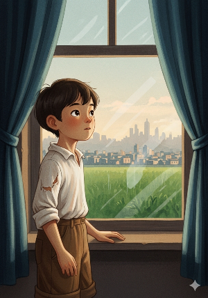 어느 날 저녁, 손자는 창가에 앉아 도시의 불빛을 바라보았어요.