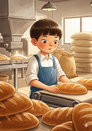 도시에 도착한 손자는 빵 공장에서 일을 시작했어요.