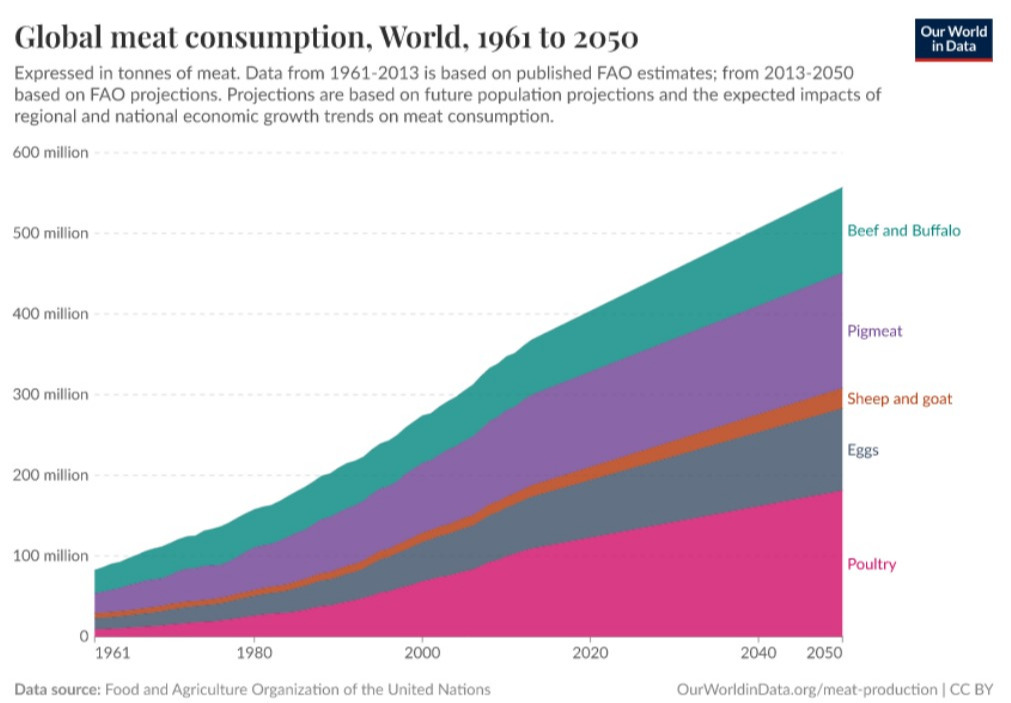 먹을 양만 늘어나는 것이 아니라 경제 수준 향상에 따라 단백질 섭취와 가공식품에 대한 수요가 함께 증가한다. 그러나 육류와 가공식품은 자원 소비량이 매우 크기 때문에, 결과적으로 농업 생산 체계는 인구 증가율 이상으로 압박을 받는다.