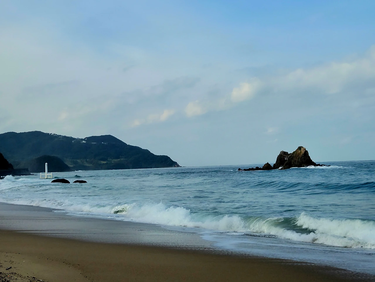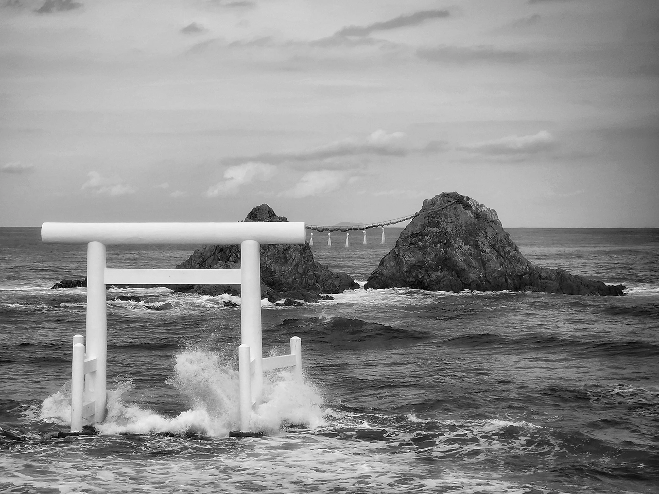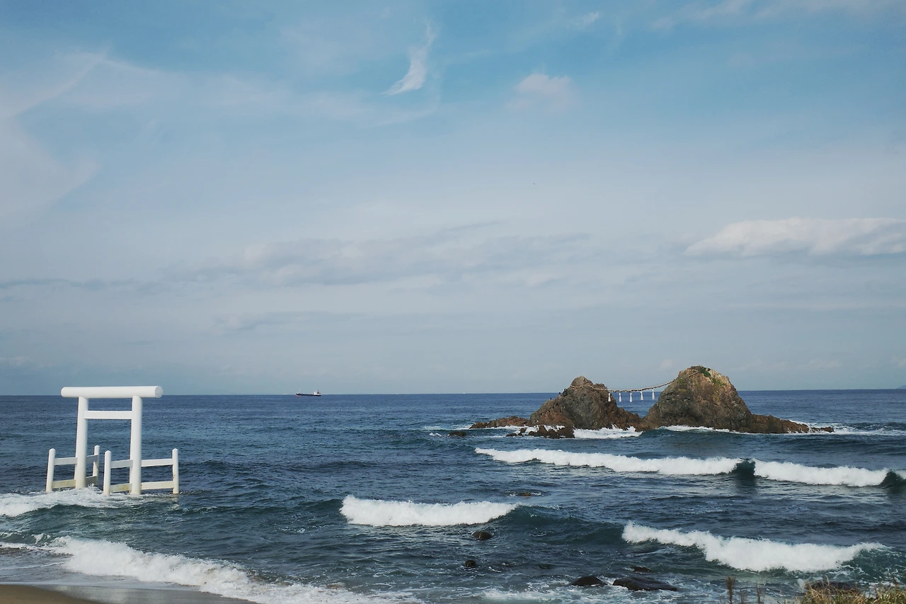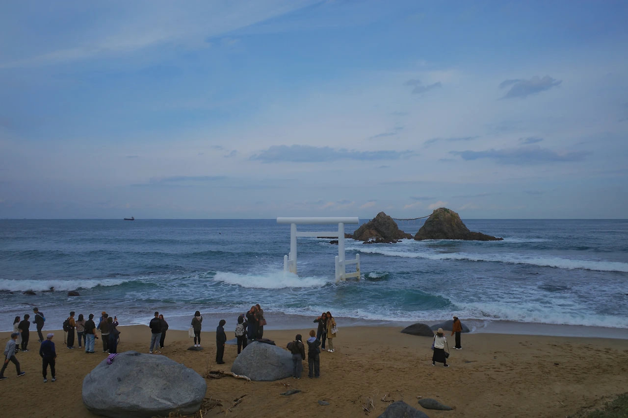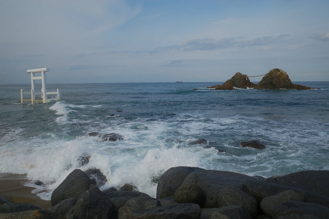 특히 흰색 토리이가 특징적이고 커다란 바위도 개가 유명하다. 나란히 서 있는 바위는 부부 바위라 불 리고 있다. 이곳의 석양은 일본 100대 석양 중 하나라 한다.