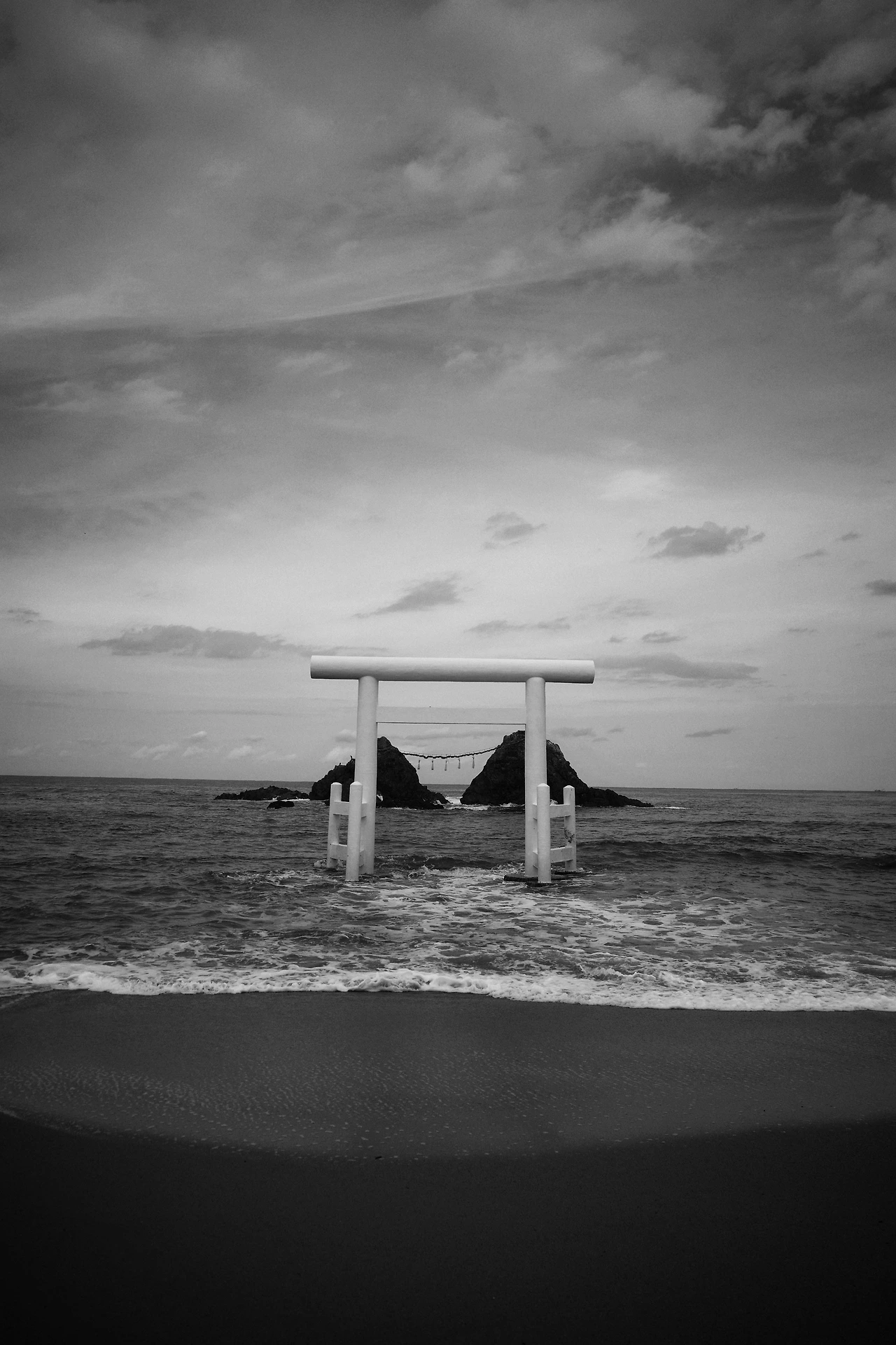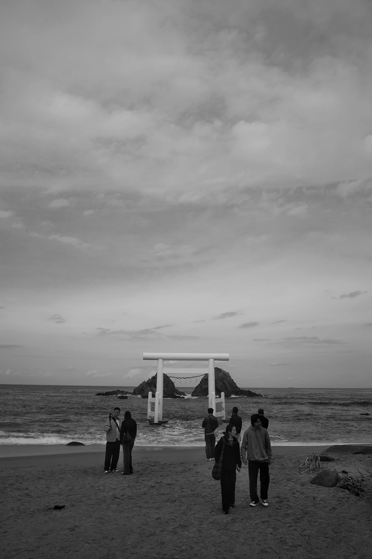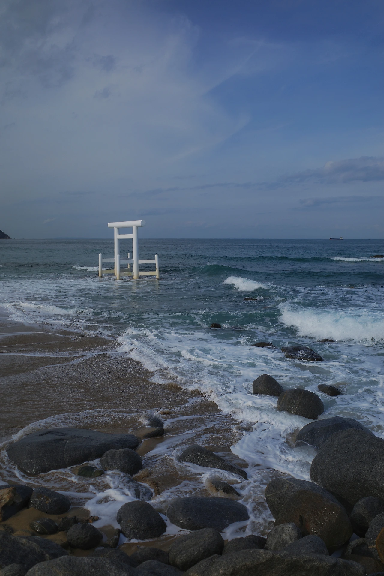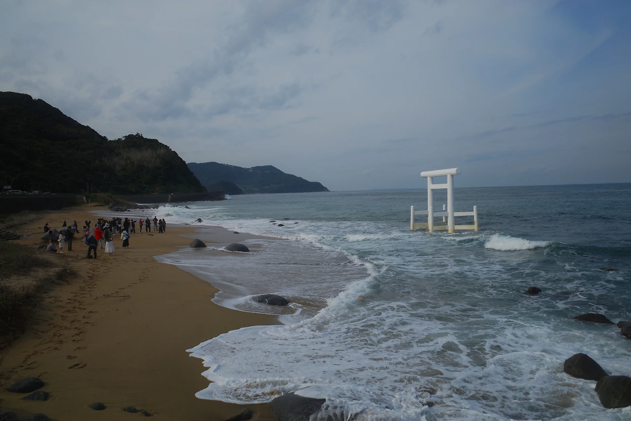 특히 흰색 토리이가 특징적이고 커다란 바위도 개가 유명하다. 나란히 서 있는 바위는 부부 바위라 불 리고 있다. 이곳의 석양은 일본 100대 석양 중 하나라 한다.