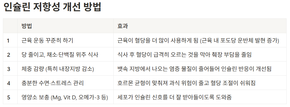 등과 허벅지, 엉덩이와 같은 큰 근육들을 운동을 통해 잘 키우는 거야. 그리고 인슐린이 너무 자주 나오지 않도록 적당한 길이의 공복 시간을 가지는 것과, 식사시에 채소를 먼저 먹는 습관도 좋아. 수면 시간도 7-8시간씩 넉넉하게 자도록 노력하고, 마그네슘이나 크롬, 비타민D와 같은 영양성분도 꼼꼼하게 챙겨 먹는 것도 어렵겠지만 정말 중요해. 이렇게 하다 보면 인슐린이라는 ‘열쇠’의 날이 깨끗하게 다듬어지는 데에 큰 도움이 될 거야. 나와 함께 잘 관리해서, 우리 한 번 잘 살아보자!