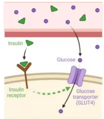 이렇게 비유할 수 있어. 포도당수송체(GLUT4)라는 자물쇠가 인슐린이라는 열쇠로 열려야 포도당이라는 밥을 세포라는 방 안으로 넣어줄 수 있겠지.