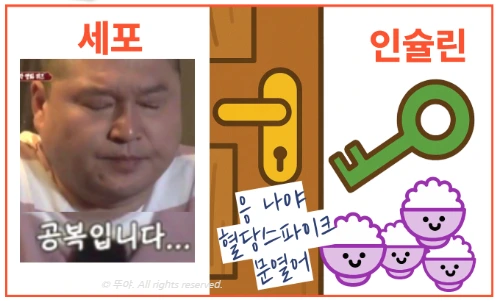 그런데 만약에 공복 상태에서 갑자기 떡이나 빵, 음료수 같은 것들이 마구 밀려들어오게 되면, 우리 혈관에는 당이 가득 차게 되는데, 신체는 이것을 위험 상황으로 인식하고 인슐린을 마구 분비 시켜. 쉽게 말해, ‘열쇠’를 마구잡이로 방문 자물쇠에 쑤셔 돌리는 거야.