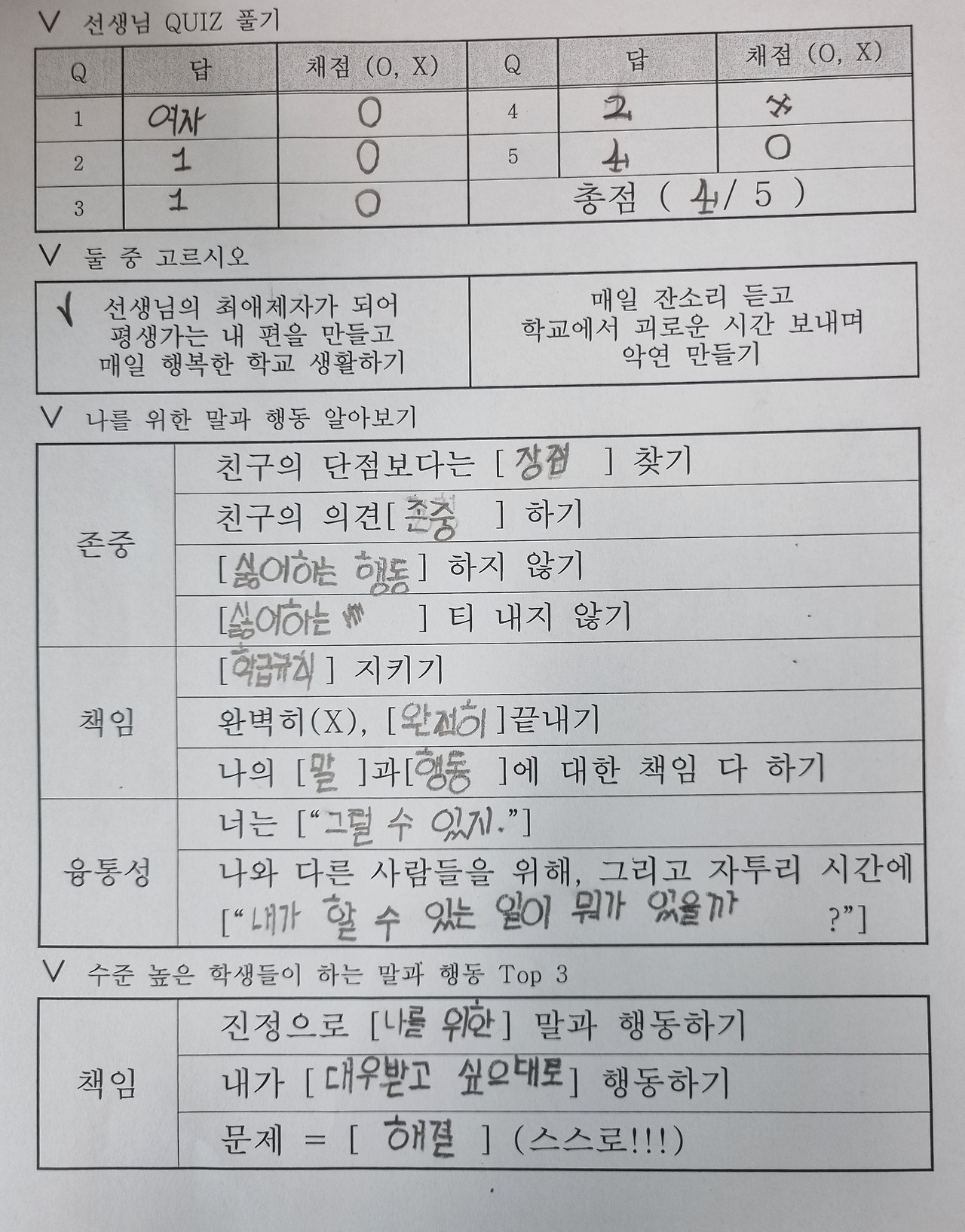 보통은 삼각이름표를 만들어 책상에 붙이는 활동도 많이 하는데 나는 이 활동을 하지 않고 1년 동안 선생님의 학급운영 철학을 퀴즈를 통해 우리 반 학생들과 공유를 하였다. 몸풀기 문제로 선생님 성별 맞추기와 선생님 이름 고르기가 있는데 이 부분에서 아이들의 긴장이 조금 풀린다. 분명 방송에서 내 이름이 나왔는데 맞추지 못한 친구들도 몇몇 보인다. 1년 동안 나와 친구들을 위한 가치 덕목인 책임, 존중, 융통성을 퀴즈로 풀어보았다. 잔소리가 섞인 많은 이야기의 주요한 내용은 '대우받고 싶은 대로 행동하라'이다. 친구가 나에게 해줬으면 하는 마음으로 친구들을 대하면 싸움이나 폭력은 절대 일어나지 않는다. 모둠활동이 많은 우리 반에서 내가 먼저 싫어하는 행동을 하지 않도록 주의해야 하고, 설령 친구가 실수를 했다고 하더라도 '그럴 수 있지!'라는 관용의 마음도 짚어보았다.
