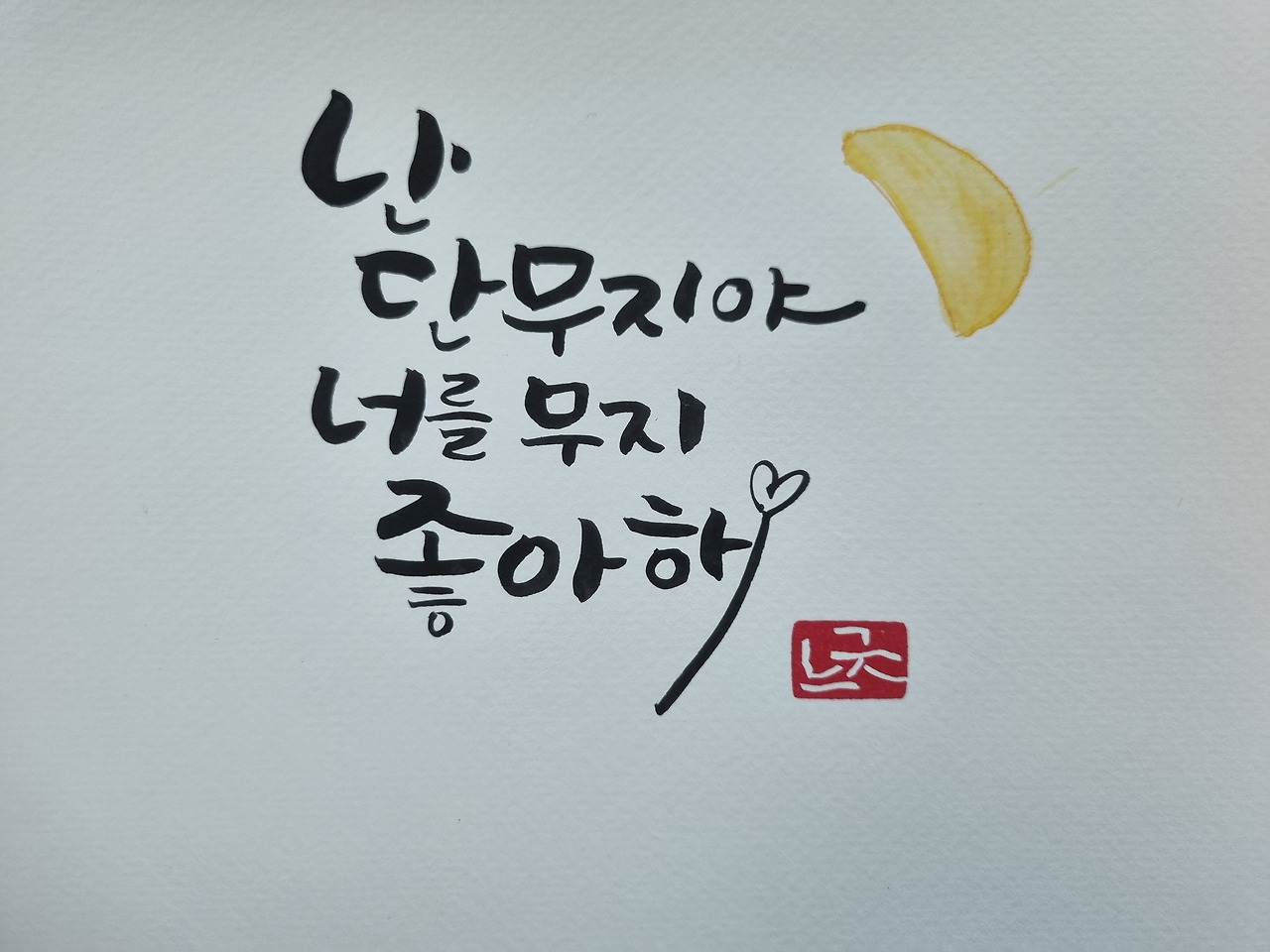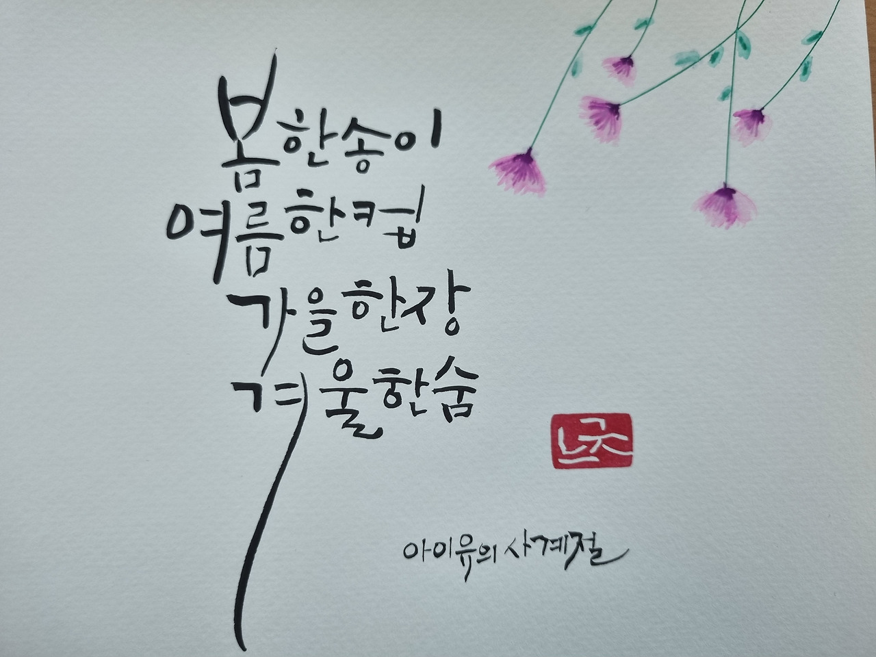 아직 여섯 번의 수업이 남아있다. 앞으로 또 어떤 작품들을 만들어 낼 수 있을지 기대가 된다. '느긋'이라는 낙관을 찍을 때마다 지우개 낙관이지만 기분이 매번 좋다. 좋은 문구, 아름답고 감동을 주는 문구, 힘이 되고 위로가 되는 문구를 한 글자씩 써내려 갈 때마다 마음 한구석이 채워지는 느낌이 든다. 역시 사람은 말하는 대로, 생각하는 대로 인생을 살아갈 수 밖에 없으므로 좋은 문구를 많이 접할 수 있는 캘리그래피를 이 나이에 다시 만난 게 너무나 감사한 일이다.