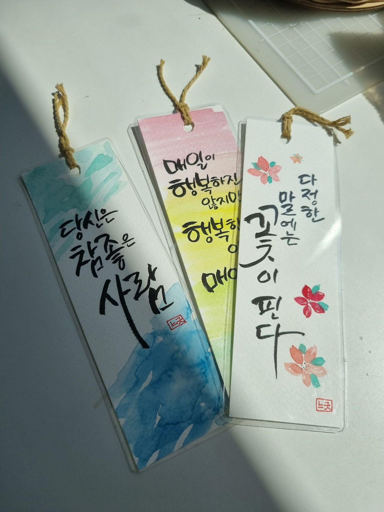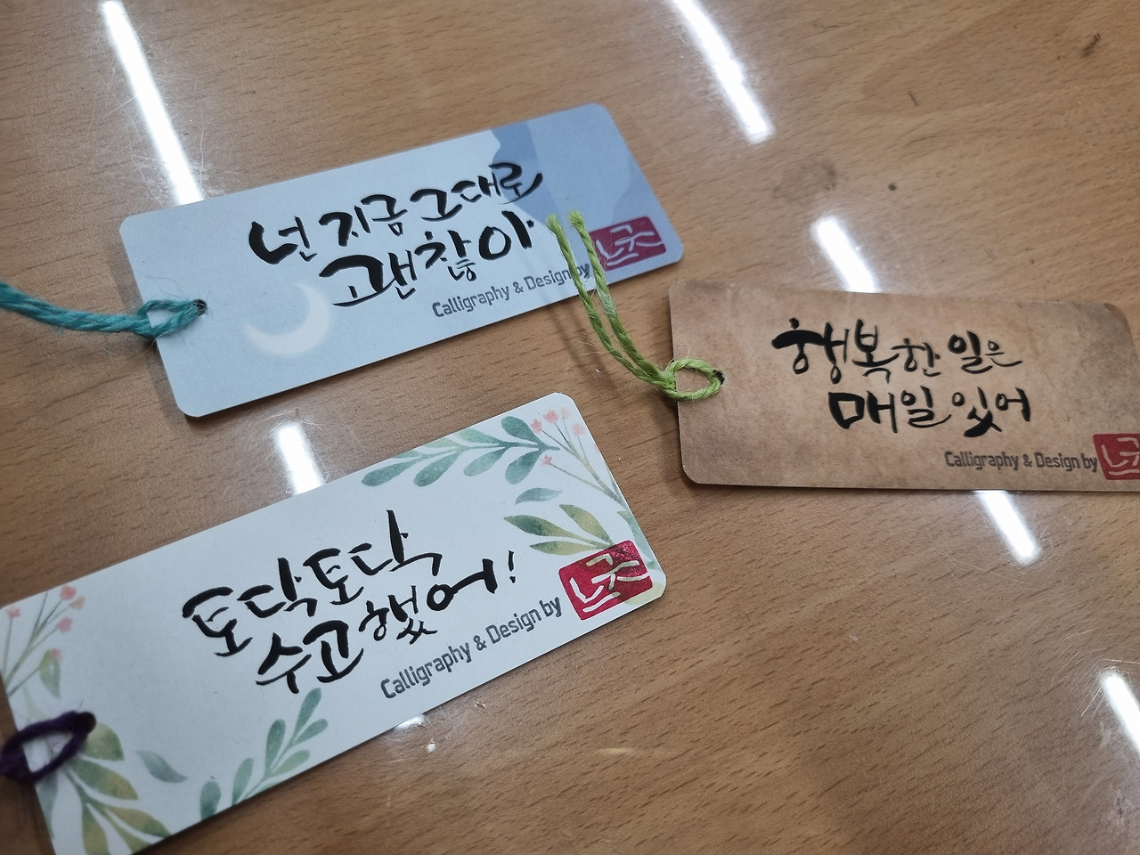 세 번째 수업에서는 책갈피를 만들었다. 강사님이 주신 예쁜 책갈피 종이의 샘플 작품을 보며 그대로 따라 하거나 교재에 나와있는 문구를 골라 몇 번의 연습 후 과감하게 작품을 만들어 갔다. 강사님에 의하면 세상이 너무나 좋아져서 예쁜 종이가 잘 나온다고, 예전에는 책갈피를 만들기 위해서 종이를 일일이 자르고 펀치로 구멍을 뚫고 그림도 그려야 하는 등 번거로웠다고 한다. 글씨만 썼는데 책갈피 종이 자체가 예뻐서 글씨까지 돋보이는 것 같았다. 그럴듯한 작품이 나와 신기했다. 다음 날에도 책갈피를 내 나름대로 만들어보기 위해 연습을 했다. 종이를 자르고 책갈피 문구에 어울리는 그림까지 그려 넣고 마지막에는 손코팅지로 코팅까지 하였다. 서툰 글씨지만 동학년 선생님들께 하나씩 드리니 정말 좋아하셨다. 감탄하고 좋아하시는 모습을 보니 선물을 주는 내가 더 행복해졌다. '당신은 참 좋은 사람', '다정한 말에는 꽃이 핀다', ' 매일이 행복하지는 않지만 행복한 일은 매일 있어'와 같이 각 선생님들이 좋아하는 문구를 가져가며 웃는 모습을 보니 캘리그래피 문구처럼 행복한 일은 나의 곁에 매일 있음에 감사함이 느껴졌다.