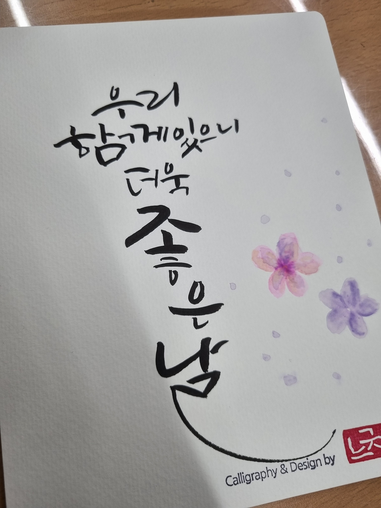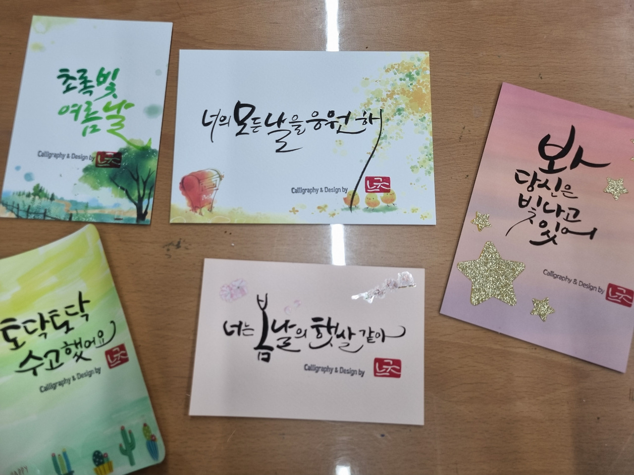 네 번째 수업에서는 캘리그래피 엽서를 만들어 보았다. 책갈피처럼 예쁜 그림이 있는 종이에 좋은 문구를 쓰는 연습 동안 마음이 따뜻해졌다. 드라마 '우영우'가 방영되었을 때 인기문구였다던 '너는 봄날의 햇살 같아'를 연습할 때면 봄이 내 옆에 성큼 다가와 있는 것 같았고, '너의 모든 날을 응원해'는 이제 막 고등학교 1학년이 된 아들을 생각하며 한 자 한 자 정성 들여 썼다. '토닥토닥 수고했어요'는 오늘 고생한 나에게 주는 위로의 말이 되었으며, '우리 함께 있으니 더욱 좋은 날'은 남편과 함께 할 노후를 생각하며 완성해 나갔다.