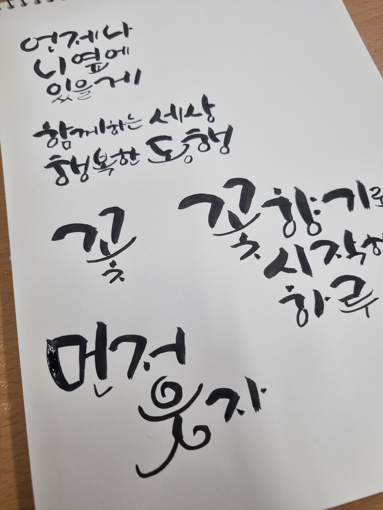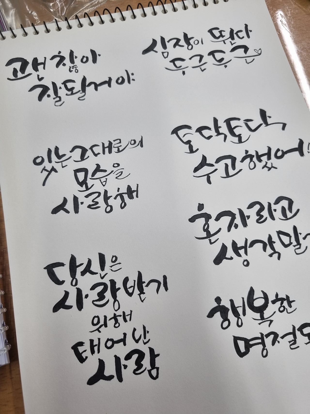 아직은 교재에 나와있는 강사님의 글씨를 따라 하는 정도지만 언젠가 내가 원하는 문구를 원하는 글씨체로 쓸 수 있을 거라 확신한다. 모창을 잘하는 사람이 노래를 잘하는 것처럼 보고 따라 쓰는 것이 캘리그래피의 70% 완성하는 것이라고 강사님께서 말씀하셨으니 꾸준히 보고 따라 쓰는 게 내 단계에서는 정말 중요한 것 같다. 또한 다른 캘리그래피 작가님의 다양한 작품들도 많이 보는 게 뇌에 무의식적으로 익혀져 구도 잡는 것에 좋은 영향을 끼친다고 하니 영상을 보는 것도 많은 도움이 될 것 같다. 이런 식으로 조금씩 익히면 30%도 채워질 거라 믿는다. 절대 욕심 내지 않고 천천히 조금씩 지속적으로 연습하면 주변 사람들에게 선물도 할 수 있을 거란 근거 있는 자신감도 생긴다.