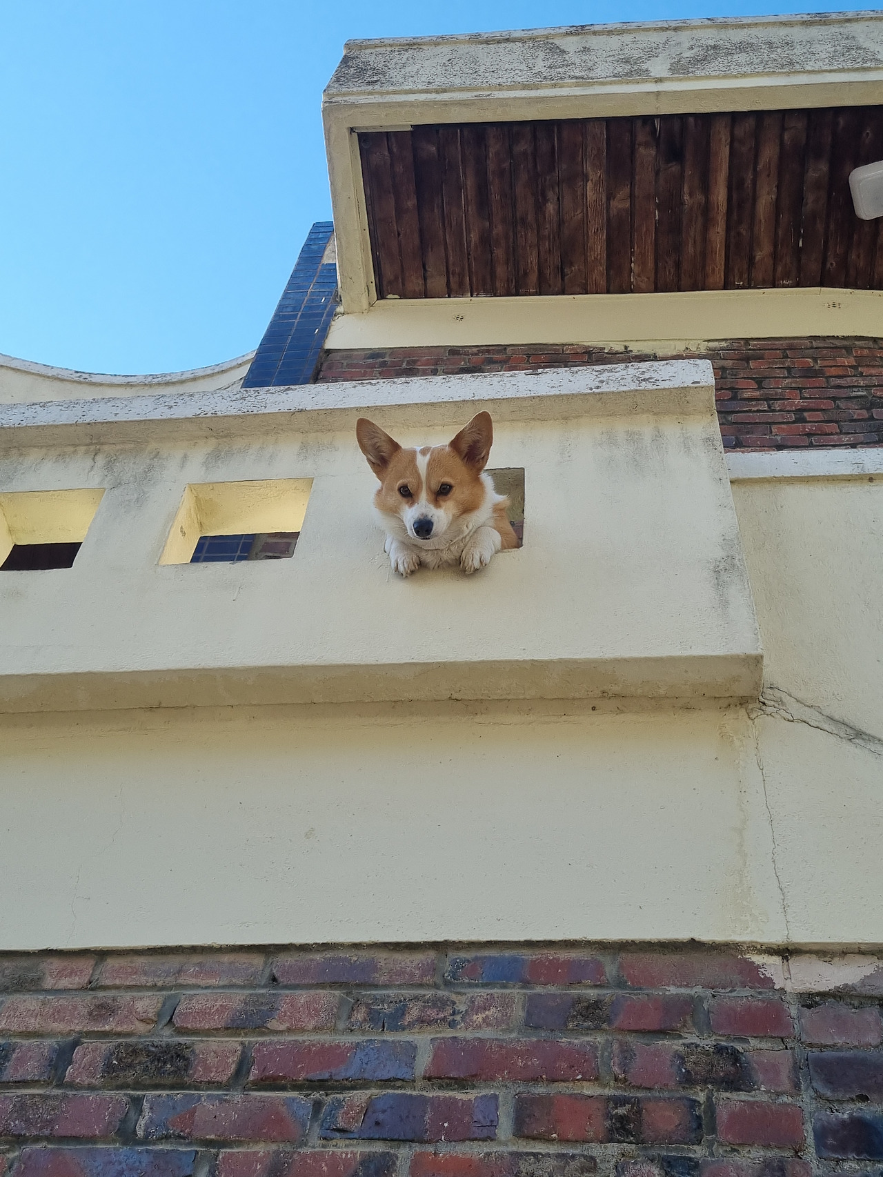 그날도 혹시나 하고 그 집 앞을 지날 때 위를 쳐다보았는데 강아지가 딱 있었다. 두둥! 빨리 사진 찍어서 이 귀여움을 세상 사람들에게 널리 알려야 한다는 사명감이 물밀듯이 몰려왔다. 가까이 가는 동안 혹시나 강아지가 놀라서 들어가 버리지 않을까 해서 아주 조심스러웠다. 강아지와 드디어 눈이 마주쳤다! 나에게 별로 관심은 없지만 그리 적대적이지도 않았다. 어쩜 이렇게 순둥순둥 짖지도 않고 사진도 잘 찍을 수 있게 가만히 있을까? 정말 곰돌이 푸우 말대로 '매일이 행복하진 않지만 행복한 일은 매일 있다'를 몸소 실감할 수 있는 순간이었다.