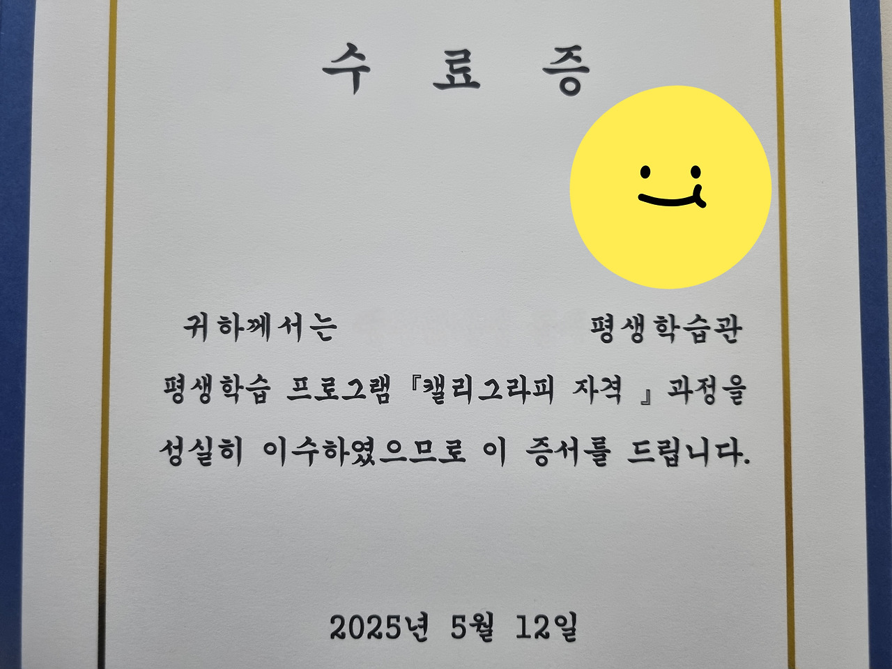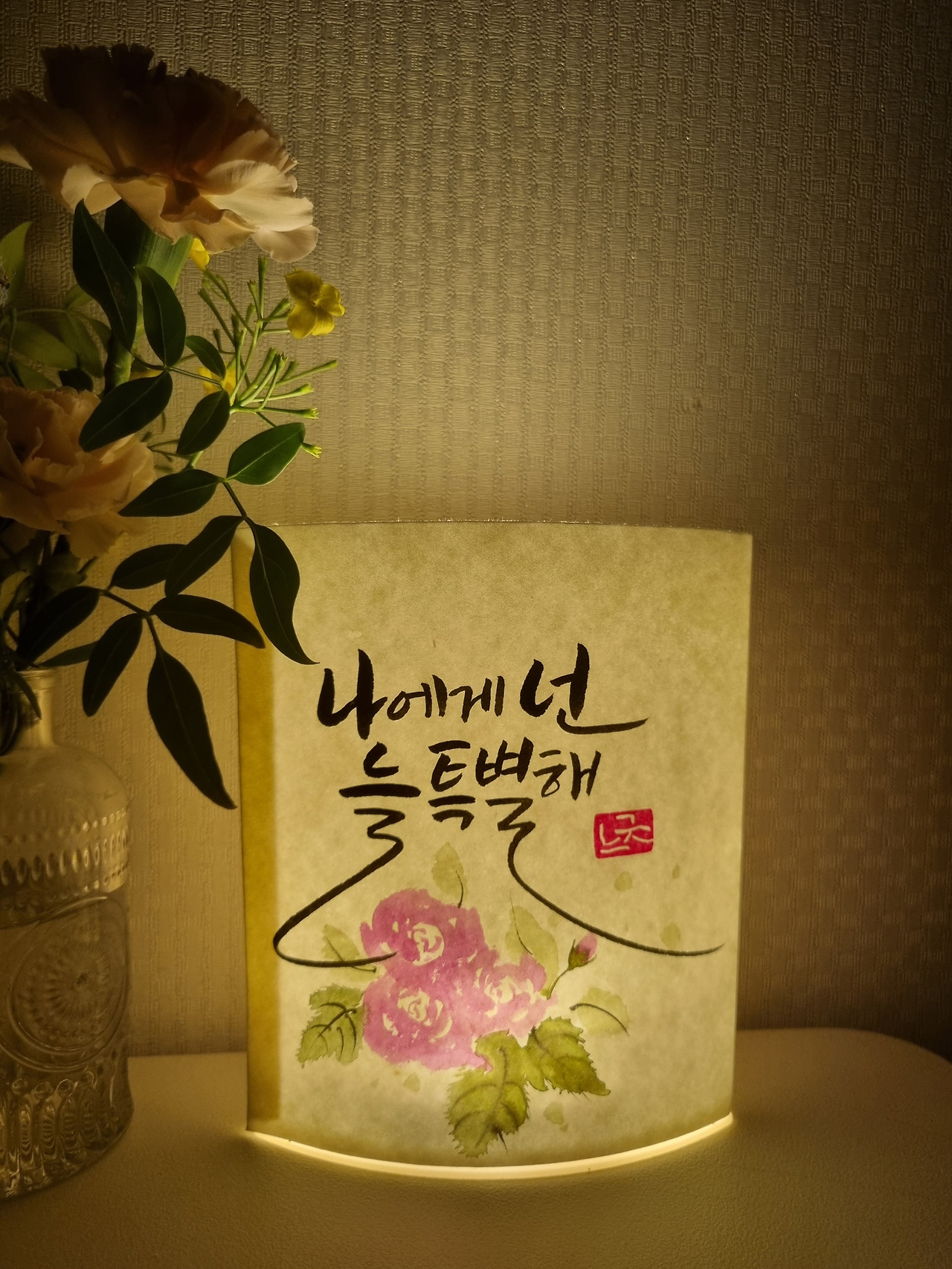 평생학습관에서 진행되었던 강좌라 마지막 날에는 멋진 수료증도 받을 수 있었다. 10회 수업동안 지각이나 결석을 단 한 번도 하지 않았던 사람으로서 수료증을 더 값지게 받았다. 이 날은 강사님이 수강생들을 위한 선물도 준비해 주셔서 매우 감사하였다. 그 선물은 캘리그래피 무드등으로 멋진 글귀를 쓰고 조명을 켜면 분위기가 있었다. 내가 글씨를 쓰면 강사님이 그에 어울리는 그림도 그려주셨다. 멋글씨에서는 글씨가 제일 중요하지만 그림이 그 글씨를 한껏 돋보이게 만들어주어 매우 신기하였다.