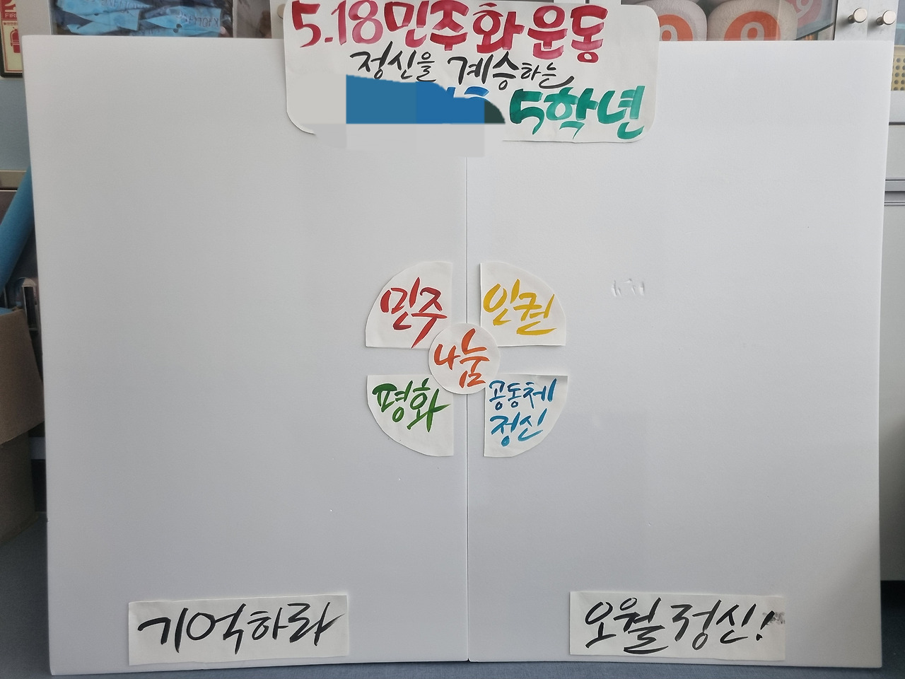 학교 전체적으로 계기교육 및 행사를 크게 하는데 이번에는 학년별로 오월쿠키도 먹고 민주주의를 위한 다짐 한 마디씩을 적을 수 있도록 했다. 이를 위한 보드판도 만들어 보았는데 예전에 배운 pop와 캘리그래피를 적절히 섞어 판을 만드니 동학년 선생님들이 칭찬을 많이 해주신다. 한 시간의 교담시간을 이용해 빨리 만들었는데 좋아해 주어서 이번에도 역시 캘리그래피를 배우길 잘했다는 생각이 들었다. 생활 곳곳에서 사용할 수 있고, 특히 교사로서 쓸모가 많아 너무나 뿌듯한 경험을 많이 하고 있다.