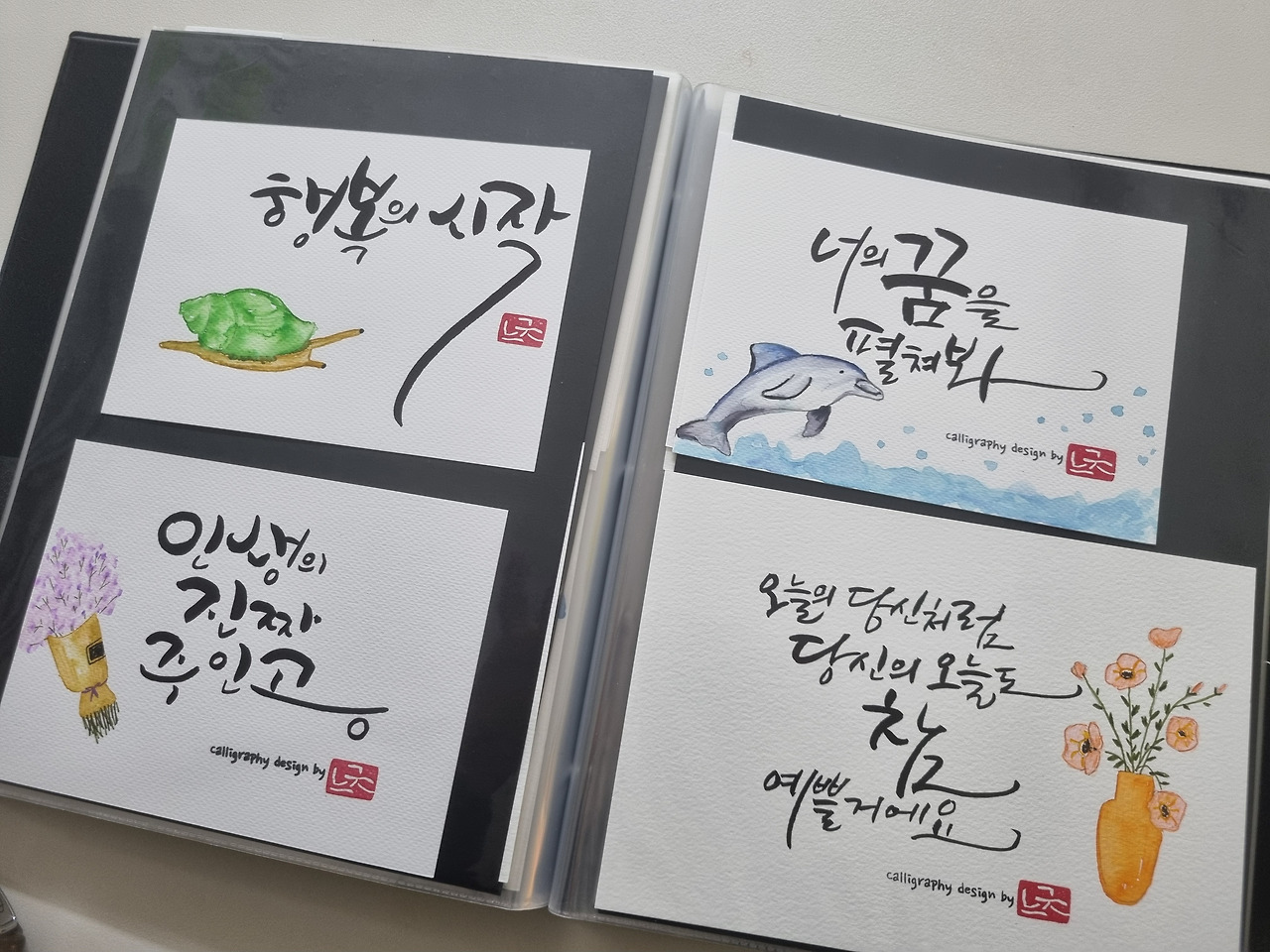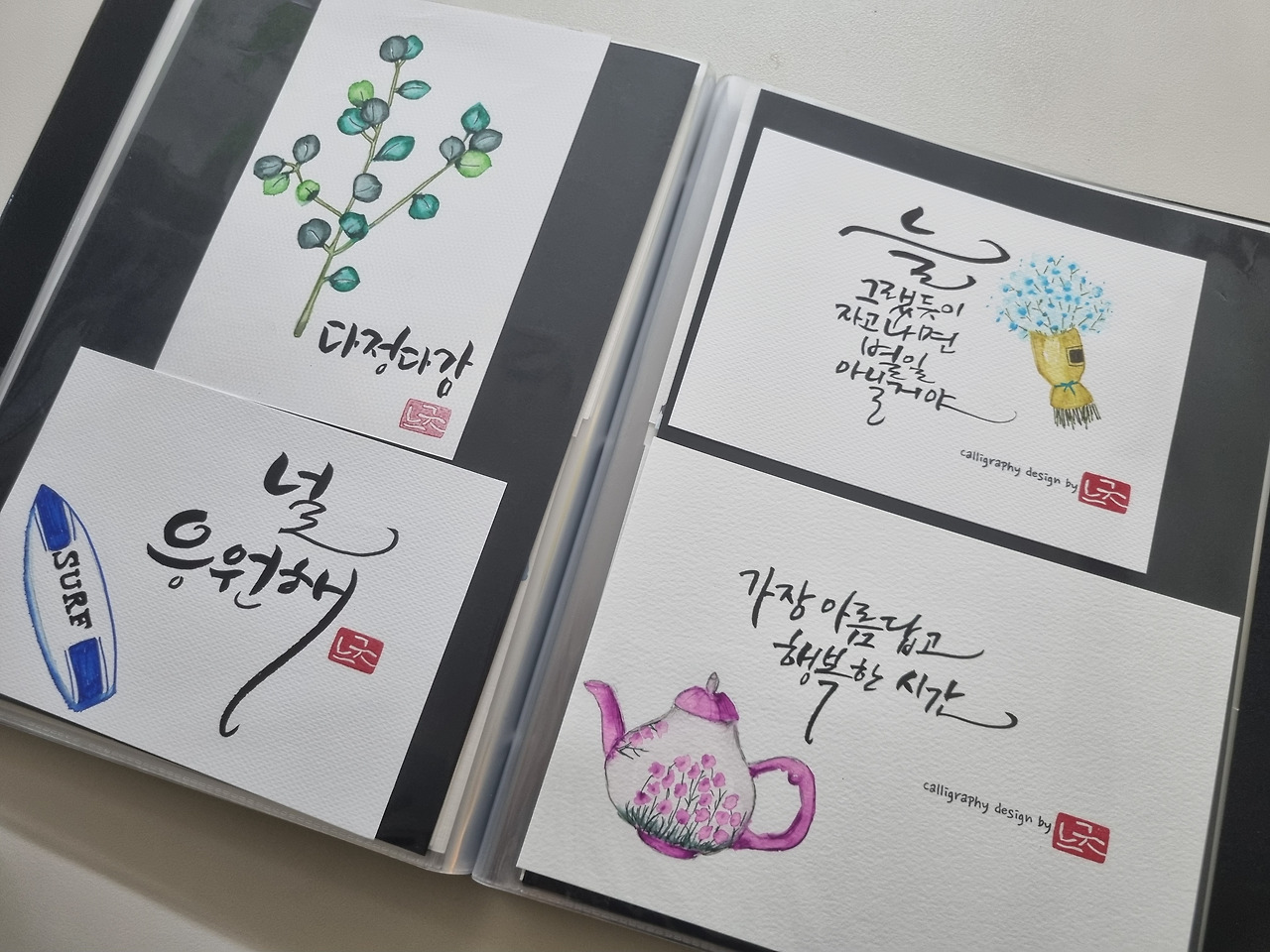 10주 동안 수업을 받고 연습한 결과물로 포트폴리오를 만들었다. 3급 자격증도 곧 나온다고 하니 뿌듯하다. 그동안 수없이 많은 연습도 하고 엽서와 책갈피를 만들어 주변 사람들에게 선물을 했다. 훌륭한 실력은 아니지만 선물할 때마다 글귀에서 감동을 받았다며 좋아하는 지인들을 보며 내가 더 기분이 좋아졌다. 주는 기쁨이라는 게 이런 건가 보다. 이번 어버이날에도 양가부모님께 용돈을 드리며 봉투에 좋은 글귀를 써서 드렸더니 잘 썼다며 감탄하시고 좋아하신다. 작은 정성을 더 했지만 돌아오는 건 더 크다. 캘리그래피를 하면서 나도 힐링이 되고 주변 사람들도 기분 좋게 만들어줘서 더없이 감사하다.