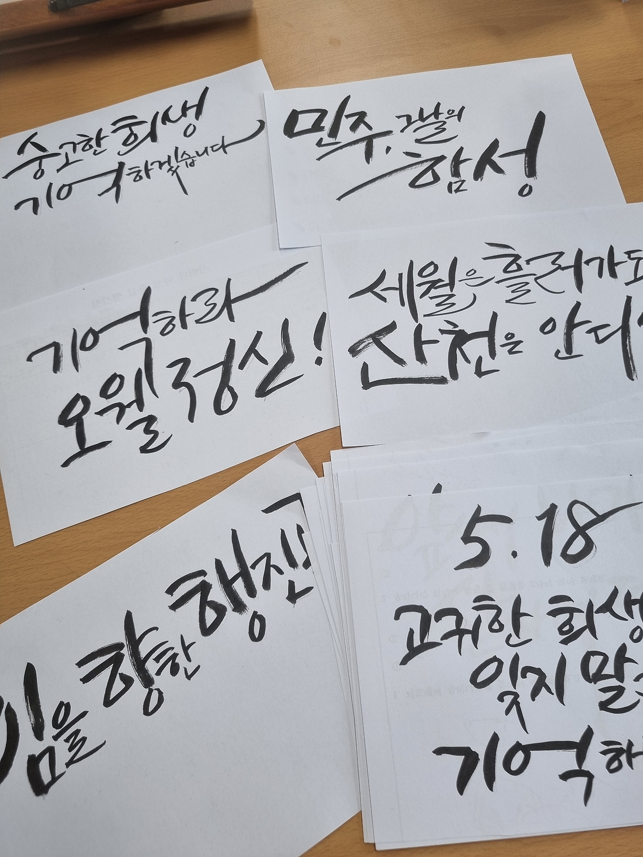 곧 있으면 5.18 민주화운동 기념일이다. 계기교육을 하고 민주주의, 연대, 인권, 공동체정신, 나눔 등의 가치에 관한 글귀를 캘리그래피로 써보는 수업을 계획하고 있다. 처음부터 잘 쓰기에는 어려움이 있으므로 보고 따라 쓸 수 있도록 예시안을 미리 준비하였다. 덕분에 나도 캘리그래피 연습을 할 수 있어 좋았다.