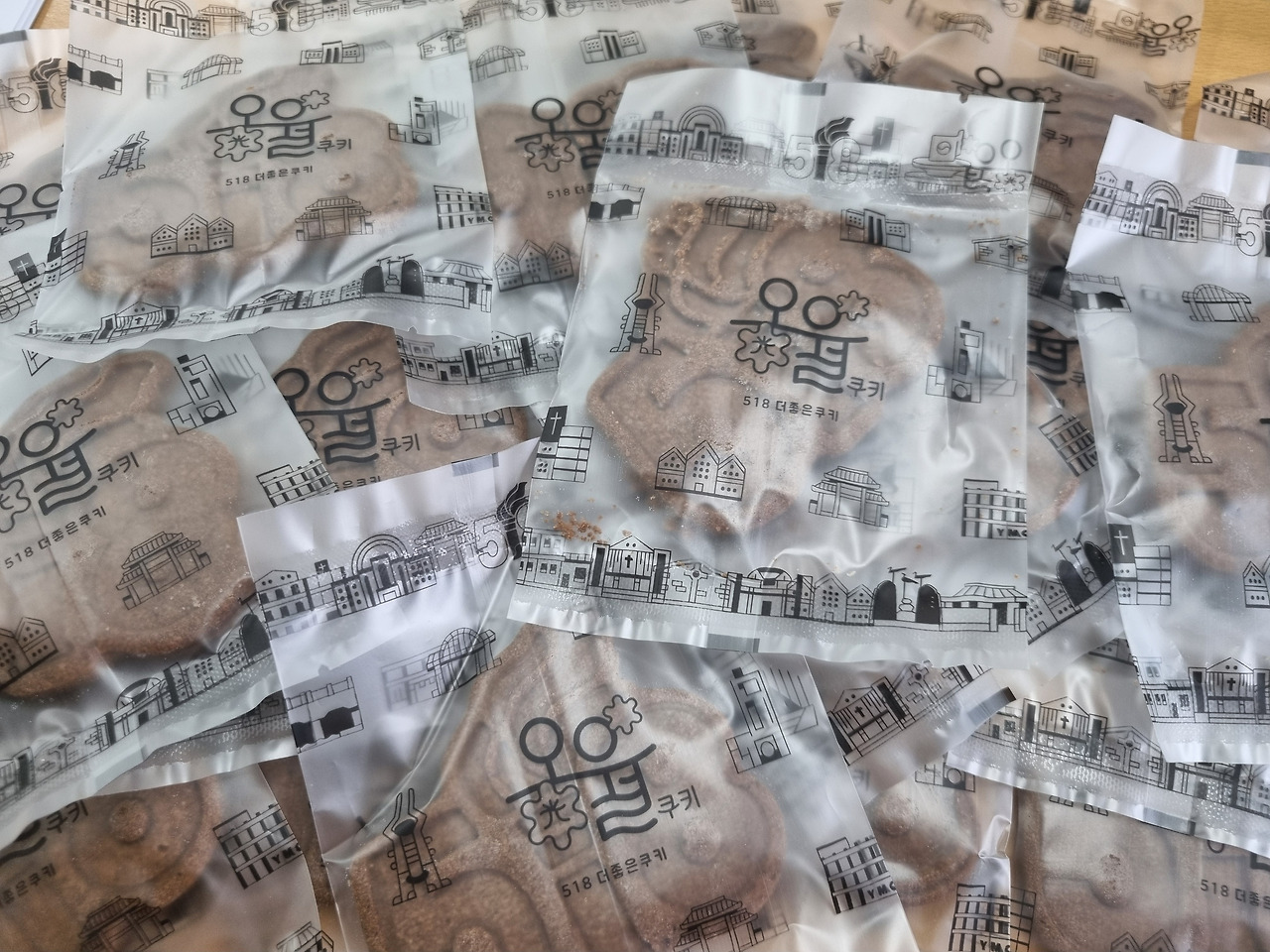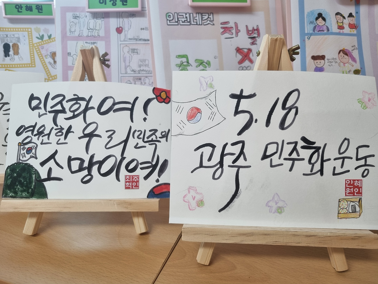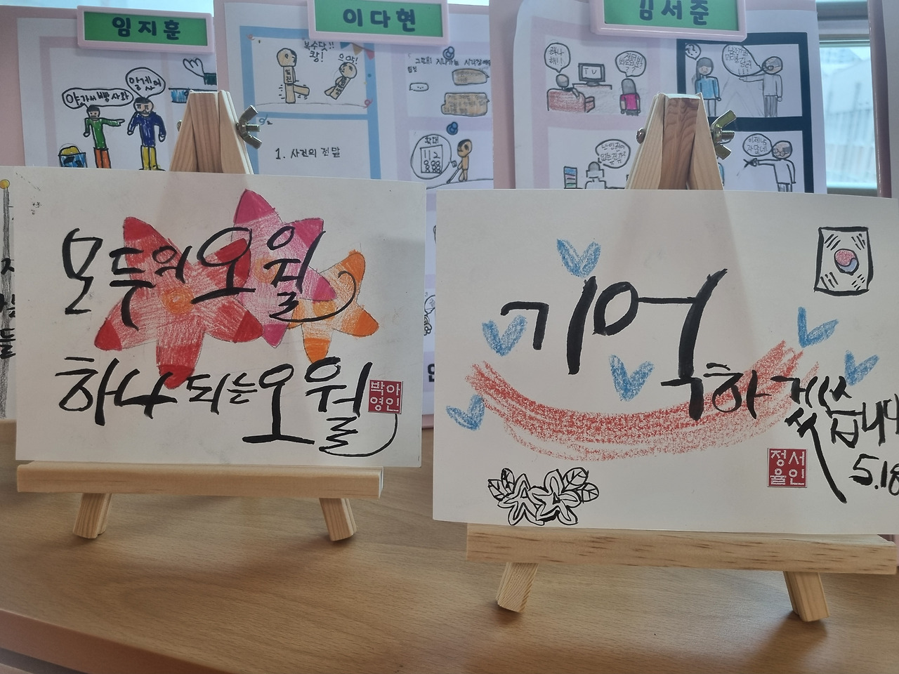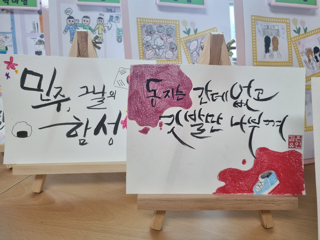 역사를 잊지 않고 그 정신을 이어가기 위한 우리 초등학생들이 너무나 기특하였다. 학교에서 오월쿠키도 사주셔서 아이들과 맛있게 먹기도 하였다. 여기에서 그치지 않고 이번 연수 때 배웠던 내용을 우리 반 미술 시간에 적용해 보았다. 캘리그래피에 '임을 위한 행진곡' 가사와 민주주의에 관한 글귀를 쓰고 꾸며 보았다. 한 글자씩 정성 들여 써가는 우리 아이들을 보니 어렸을 때부터 역사수업이 매우 중요함을 다시 느꼈다. 이면지에 연습을 여러 번 한 후 붓펜으로 캘리그래피를 쓰게 하였는데 진지하게 참여하는 모습에서 미래의 희망이 보였다. 낙관처럼 보일 수 있게 빨간색으로 이름도 출력해서 붙이게 하였더니 꽤 그럴듯하여 아이들의 만족감이 매우 높았다.