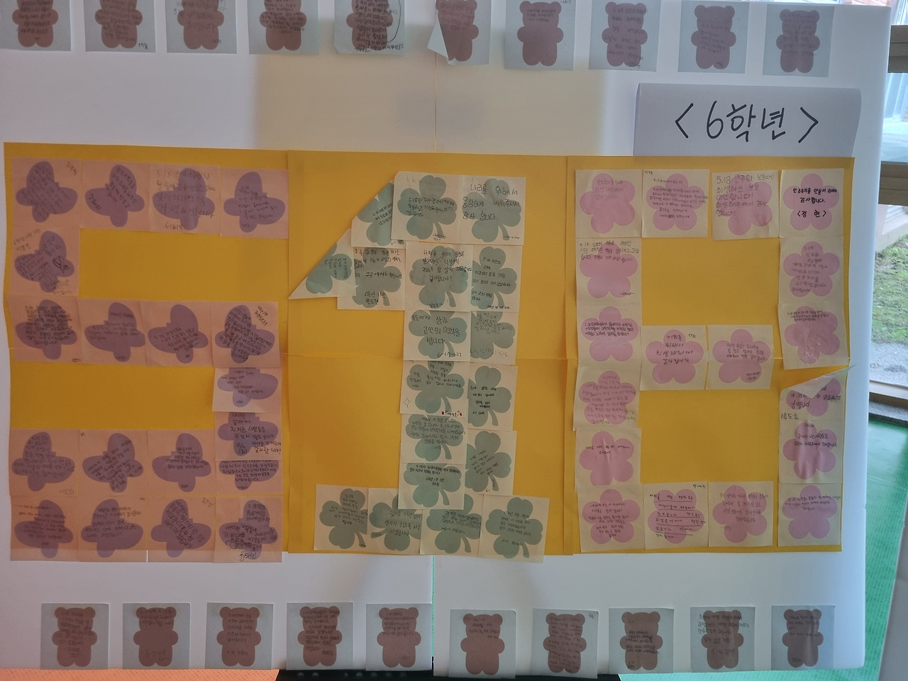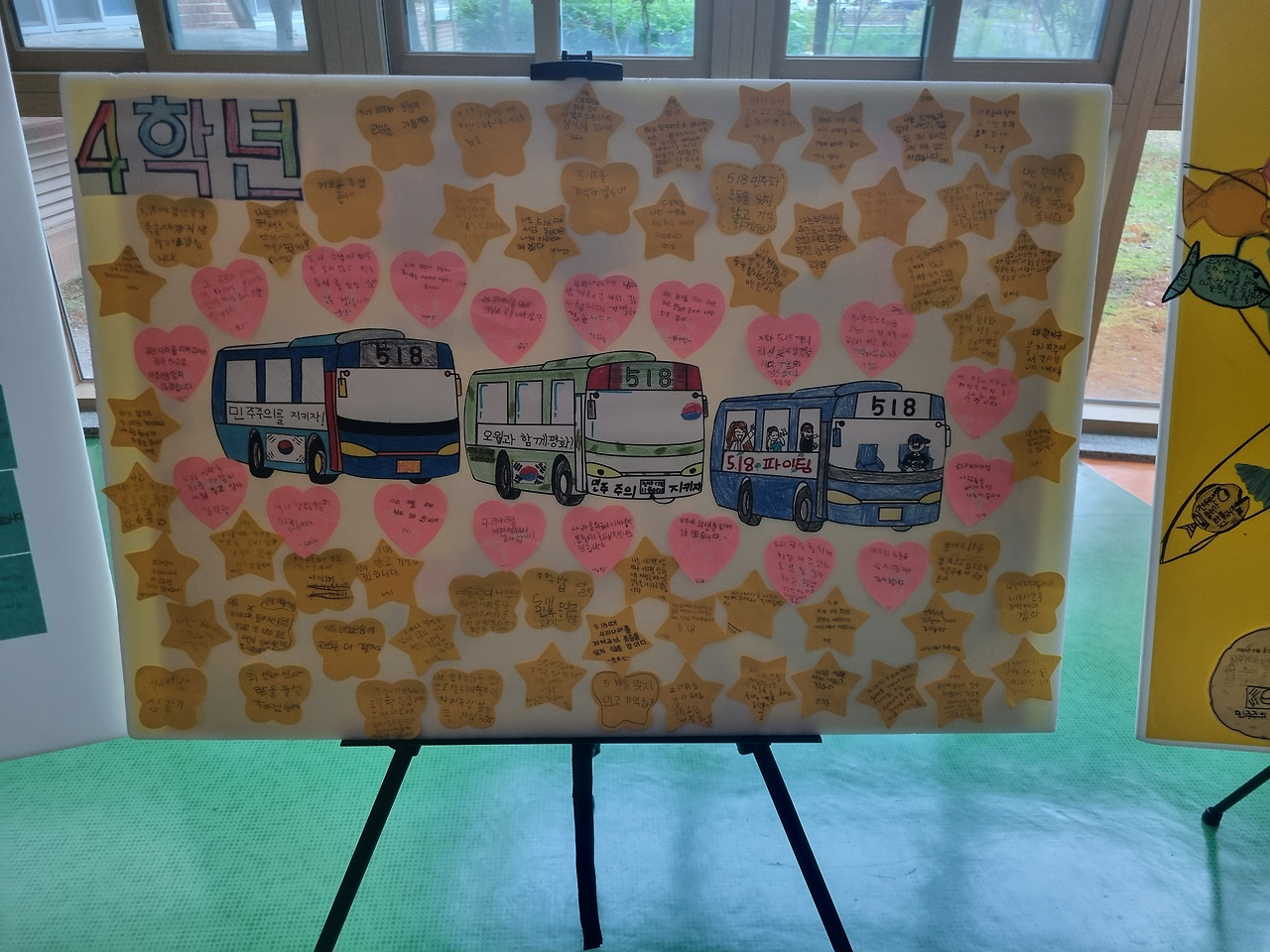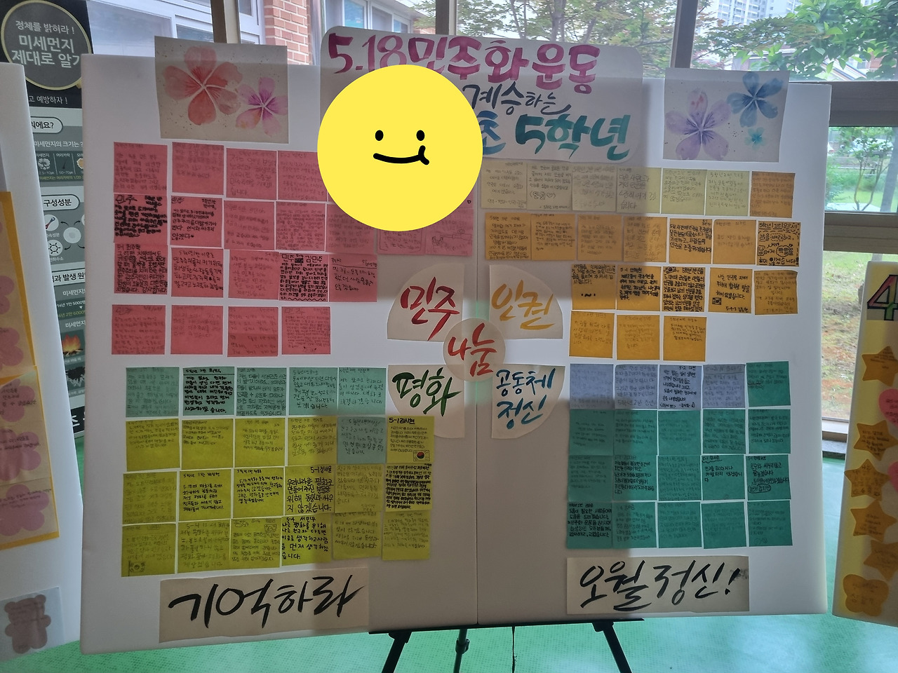 5.18 민주화운동에 관한 전개과정을 보여 준 후 일상생활 속에서 연대, 민주정신, 나눔, 공동체정신, 평화, 인권 등을 실천할 수 있는 다짐을 포스트잇에 붙여 역사를 다시 돌아보게 하였다. 물고기 모양을 만들어 표현한 3학년의 멋진 아이디어가 매우 돋보였다. 여러 물고기들이 한마음이 되어 독재와 탄압을 상징하는 검은색 물고기를 쫓아내는 장면에서 연대의 큰 힘을 느낄 수 있었다. 4학년의 민주버스를 둘러싸고 있는 별모양과 하트모양의 메시지가 민주주의를 지켜주고 있는 듯 보였다. 5, 6학년은 고학년답게 내용이 아주 훌륭하였다. 많은 사람들이 볼 수 있는 1층 중앙현관에 교감선생님이 직접 전시까지 해주셔서 아이들이 더 뿌듯할 것 같았다.