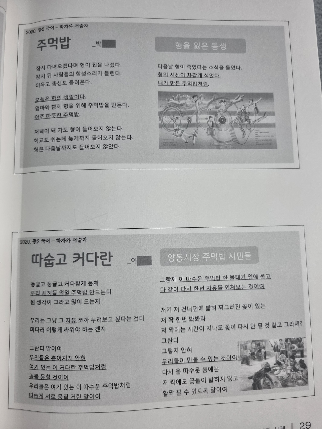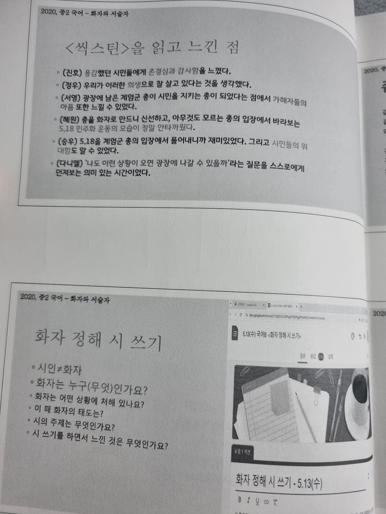 확실히 중학교 수업이라 초등학교 수업과 달리 심도가 있었다. 이를 조금 쉽게 변형하면 초등학교 고학년 학생들에게도 적용시킬 수 있을 것 같아 유심히 보았다. 역사수업에서 적용하는 수업뿐 아니라 국어 시간에 '식스틴'이라는 제목의 책을 읽고 서술자의 눈으로 5.18을 새롭게 바라보는 수업을 보여주셨다. 특수부대에서 교육받고 광장에 투입된 계엄군의 총인 식스틴의 눈으로 바라본 5.18은 과연 어땠을까? 진실을 몰랐던 서술자(식스틴)가 진실을 알고 생각을 바꾸는 과정에 독자도 함께 몰입하여 5.18의 진실에 공감하게 된다는 내용이었다. 책을 읽고 학생들이 쓴 느낀 점을 보았는 생각이 너무나 기특하여 매우 감동하였다. 책을 읽고 난 후 시로 표현한 작품은 중학생들이 쓴 시라는 생각이 안들 정도로 가슴 아픈 우리 역사를 잘 표현하기도 하였다.