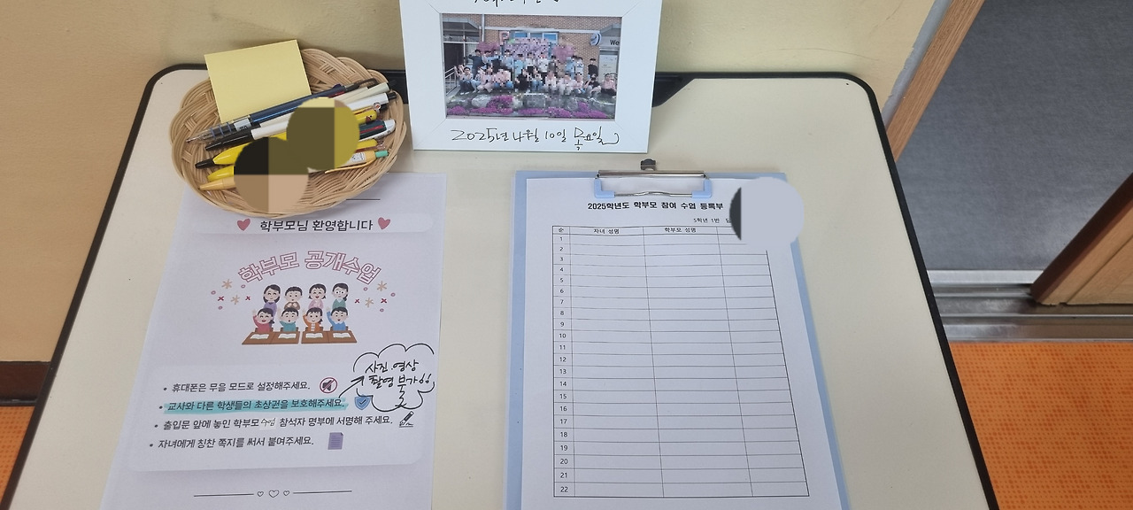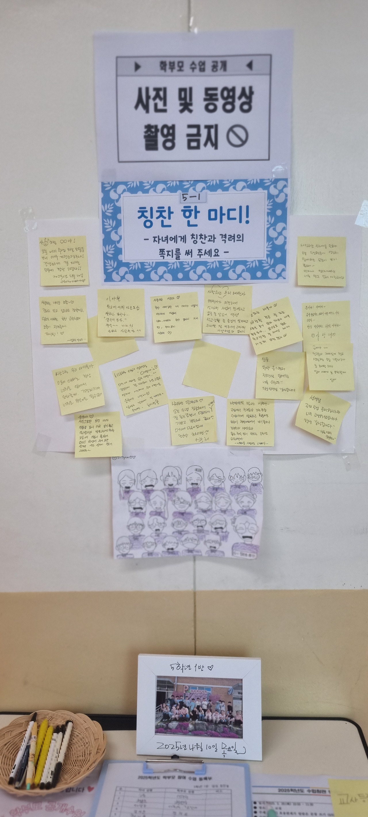 하루 전 복도에 참관록과 등록부를 준비해 두고 '우리 아이에게 해주고 싶은 칭찬과 격려의 말'을 쓸 수 있는 자리도 마련하였다. 학부모 공개수업에 관한 주의 사항도 잘 보이도록 배치하고 촬영금지도 강조해두었다. 지난 4월 '핑크셔츠데이(학교폭력예방을 위한 날)'에 찍은 아이들 사진 액자도 갖다 두니 훨씬 분위기가 좋아진 느낌이다. 복도에 있는 학생들 작품도 바람에 날리지 않게 재정비하였고 문틀에 쌓여있는 먼지도 이번참에 쓸어내었다.
