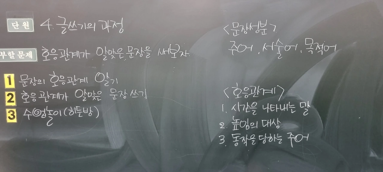 공개 수업 때도 평소 수업을 있는 그대로 보여주고 싶은 마음이 항상 깔려 있어 이번에도 부담 없이 준비를 하였다. 다만 학부모가 공개수업에 오는 가장 큰 이유는 자녀가 발표를 하는 모습을 보고 싶어 한다는 것을 알기에 우리 반 모든 친구가 발표를 할 수 있도록 계획하였다. 학습 주제로 발표 기회가 많이 있는 5학년 1학기 [국어 4단원 글쓰기의 과정] 6차시인 '호응 관계가 알맞은 문장 쓰기'를 선택하였다.