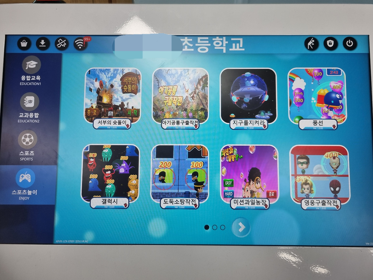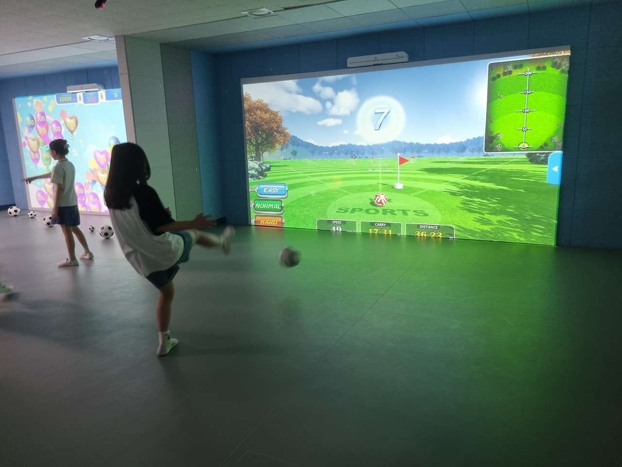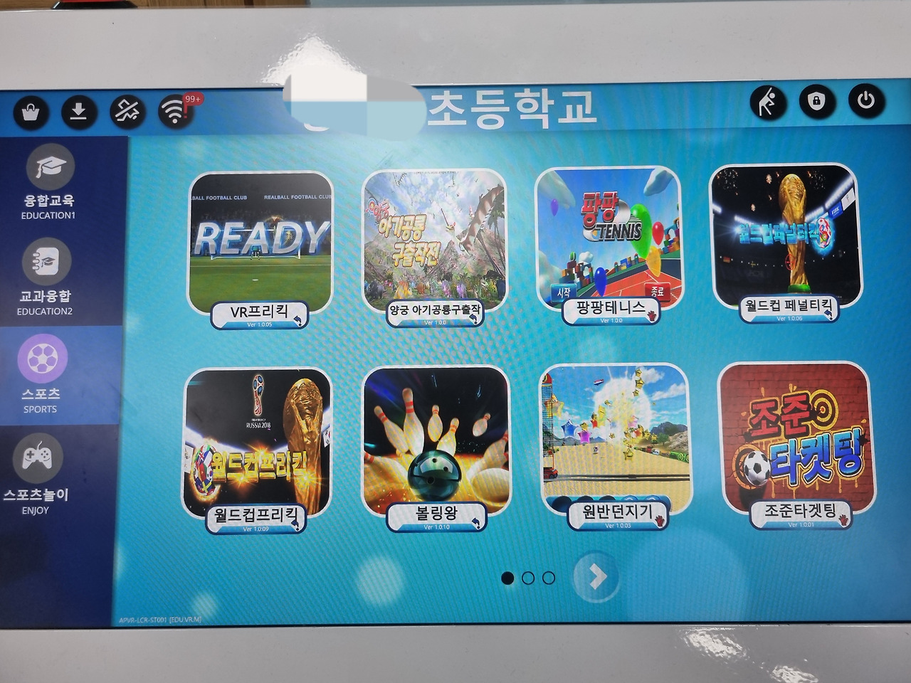 우리 학교는 강당과 운동장 이용 시간뿐 아니라 VR스포츠실 시간도 배정되어 있다. 작년에 처음 생겨 학생들이 새롭고 신선한 경험을 하고 있는 중이다. 스포츠 가상현실체험관으로 체육시간 중 학생들이 제일 재밌고 적극적으로 활동을 한다. 운동장과 강당에서 체육을 하는 경우 가끔 컨디션이 안 좋거나 발목이 아파 활동에 참여하지 못하는 아이들이 생기지만 VR 스포츠 활동은 모든 학생이 능동적으로 참여 한다. VR스포츠실은 여러 가지 활동을 실제로 하는 것처럼 경험할 수 있기 때문에 매우 즐거워 보인다. 테니스, 양궁, 볼링, 원반 던지기, 프리킥 등 평소 학생들이 경험하기 어려운 스포츠를 직접 해 볼 수 있다. 지정된 곳에 서서 양궁 화살을 화면에 있는 과녁에 맞힐 수 있고 볼링공도 굴리면 화면에 실제와 비슷한 상황이 벌어진다. 프리킥과 원반 던지기는 자신의 거리까지 분석을 해주니 아이들이 즐겨하는 활동 중 하나이다. 이를 통해 자연스럽게 스포츠 규칙을 알 수 있고 다양한 경험을 편하게 할 수 있는 등 장점이 많아 이 시간은 꼭 빼놓지 않기 위해 노력을 한다. 스포츠놀이 부분에서는 풍선 터뜨리기, 미션과일농장, 도둑소탕작전 등 게임을 통해 신체활동을 재밌게 할 수 있다.