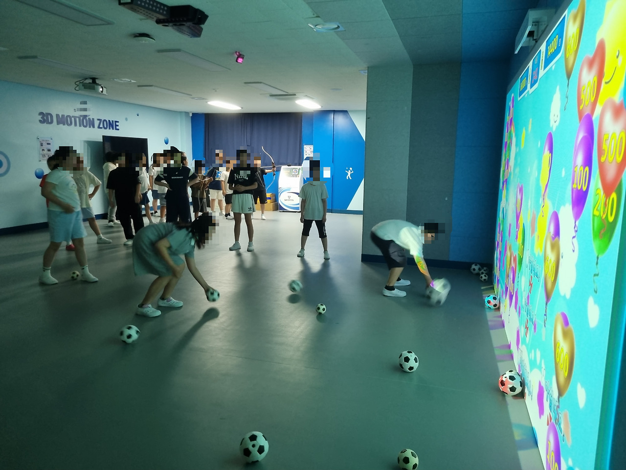 A팀은 프리킥과 풍선 터트리기를 선택하였다. 공을 일정한 공간에 두고 차면 속도, 캐리, 거리까지 한눈에 쉽게 분석이 되고 이를 통해 어디를 어떻게 공을 차야 멀리 나가는지 눈으로 직접 확인할 수 있으니 좋다. 이 과정에서 팀장은 운동팀과 건강팀 팀원들의 활동 순서도 챙겨야 하므로 팀장의 역할이 쉽지만은 않다. 멀리 차는 친구가 있으면 호응도 해주고 어느 부분을 차라고 알려주는 모습이 매우 예쁘다. 풍선 터트리기는 제한 시간 안에 화면에 공을 던져 풍선을 터트리면 되는 활동으로 풍선마다 색이 달라 잘 조준을 해야 한다. 아이들이 쉽게 흥분할 수 있으므로 공을 사람에게 던지지는 않는지, 화면에 잘 던지는지, B팀 영역에 공이 넘어가지는 않는지 잘 확인해야 한다. 너무 의욕이 앞선 나머지 소리를 질러 다른 사람에게 피해는 주지 않는 것도 주의사항으로 일러두어야 한다.