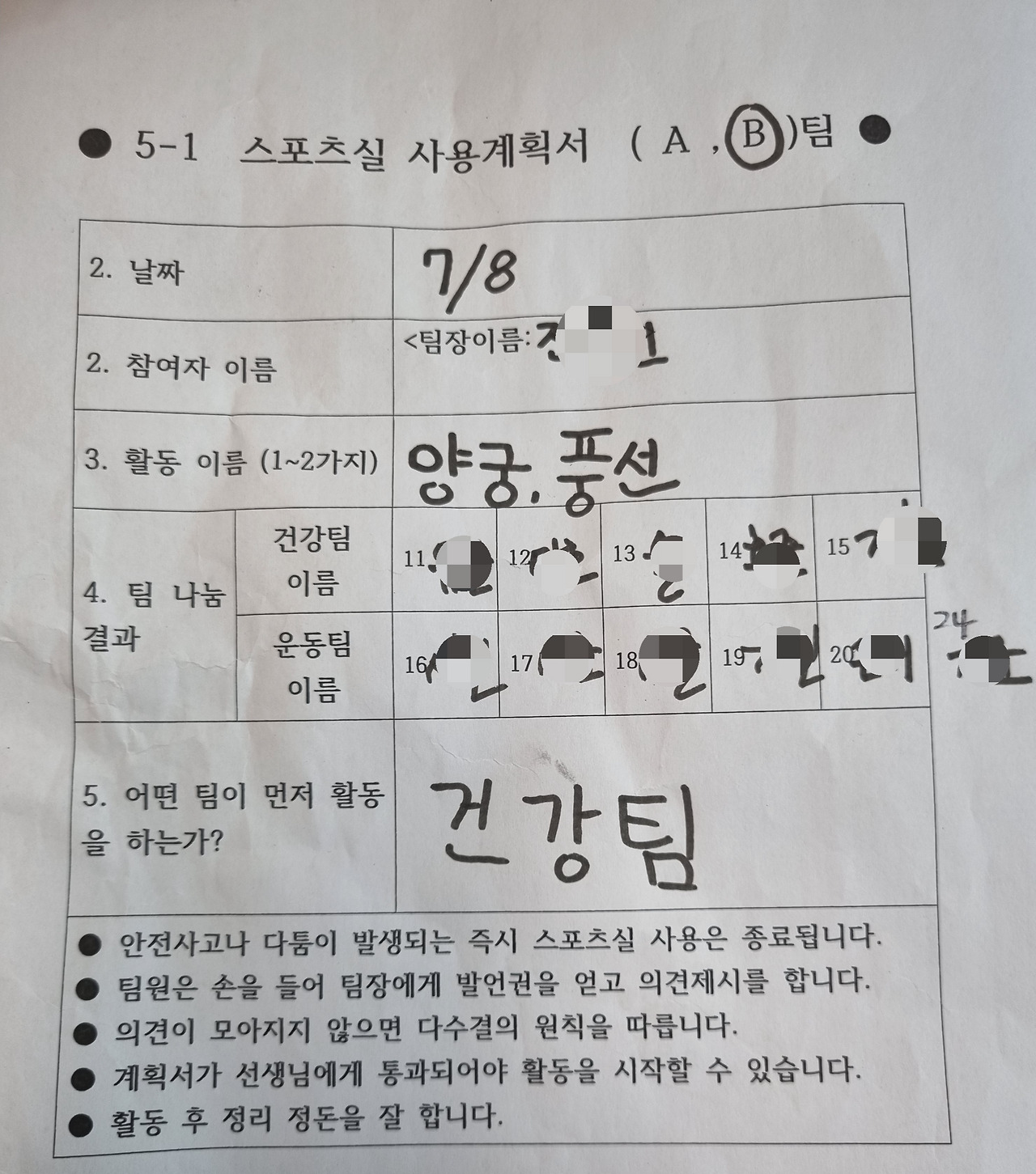 학생들이 활동에만 너무 과하게 집중하다 보면 크고 작은 안전 문제들이 생길 수 있으므로 학기 초부터 VR스포츠실 사용에 대한 규칙을 정하고 여러 번 지도를 한다. 우선 화면이 두 개이므로 A와 B팀으로 나누어야 한다. 우리 반에는 숫자가 적혀있는 탁구공을 활용하여 일명 '로또'방식으로 팀을 나누면 불만을 갖는 사람이 없다. 숫자를 뽑으면 번호대로 자연스럽게 팀이 선정된다. 1번부터 12번까지는 A팀이고, 13부터 24번까지는 B팀이다. 각팀에서 번호대로 운동팀과 건강팀으로 바로 나뉘고 번호 순서대로 활동순서까지 정해지므로 매우 효율적인 방법이다. 준비체조와 팀 선정은 교실에서 이루어지고 스포츠실에 가면 바로 활동을 할 수 있으므로 버리는 시간이 없이 착착 진행이 된다. 역시 5학년 같은 고학년은 한두 번만 알려주면 알아서 척척하는 맛이 있어 개인적으로 고학년이 나랑 잘 맞는다.