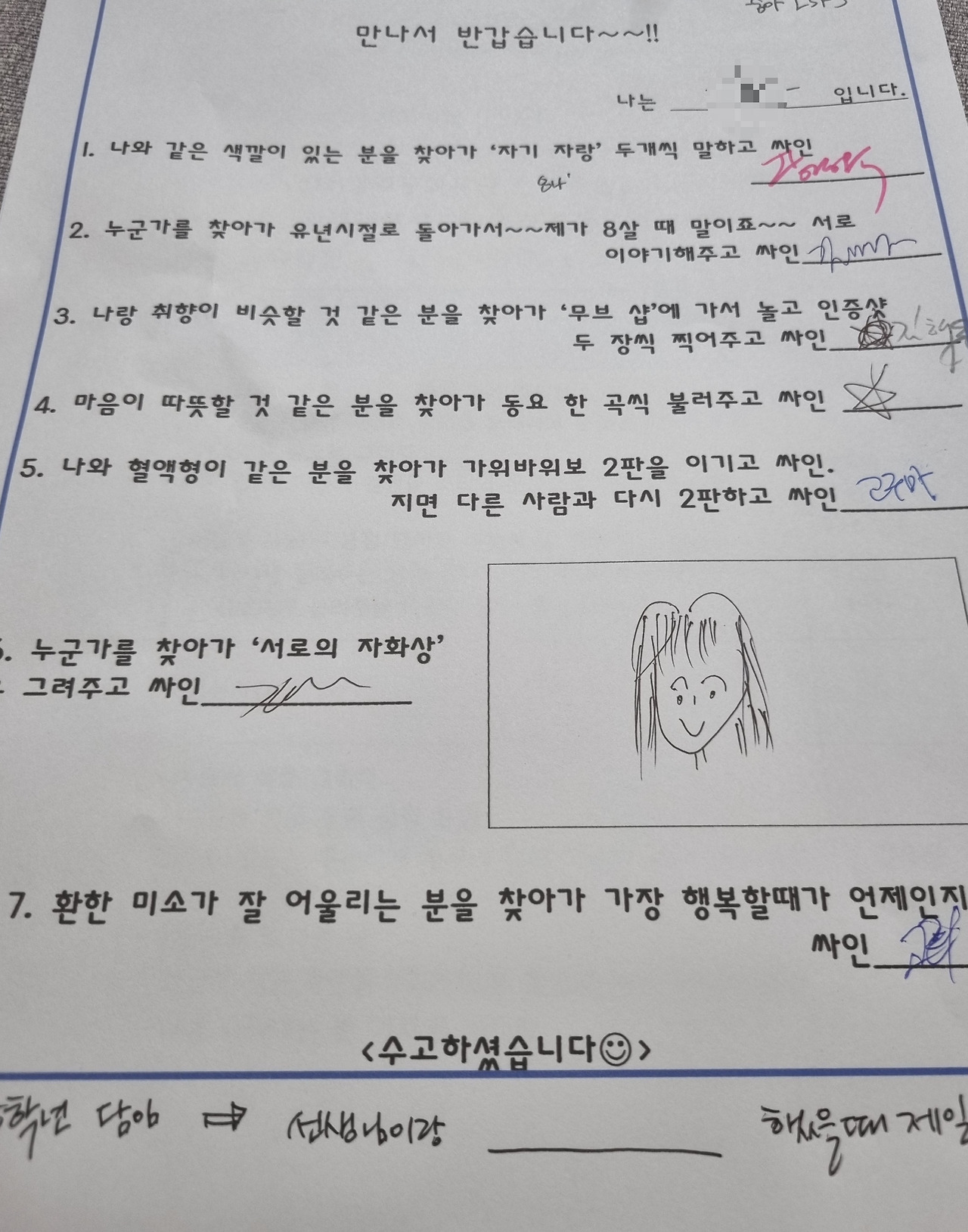 '만나서 반갑습니다' 활동은 자유롭게 교실을 돌아다니며 서로에 대해 좀 더 알아보는 시간이었다. 초등학생으로 돌아간 느낌으로 활동에 임하니 더 열심히 할 수 있었다. 질문을 살짝 바꾸면 교실에서도 재미있게 활동할 수 있을 것 같았다. 내가 평소에 하는 활동들이 다 문화예술교육과 관련이 있다고 생각하니 너무 어렵게만 느껴지지 않았다. 시간이 짧아 한 사람과 깊게 이야기를 나누지 못해 조금 아쉬웠지만 누군가를 알아가는 과정을 통해 나 자신도 알아갈 수 있는 기회가 되어 익숙하면서도 뜻깊었다. 정리 과정에서 활동에 대한 생각이나 느낌을 공유하고 감정을 나누며 공감을 해주는 활동이 참으로 따스하였다.