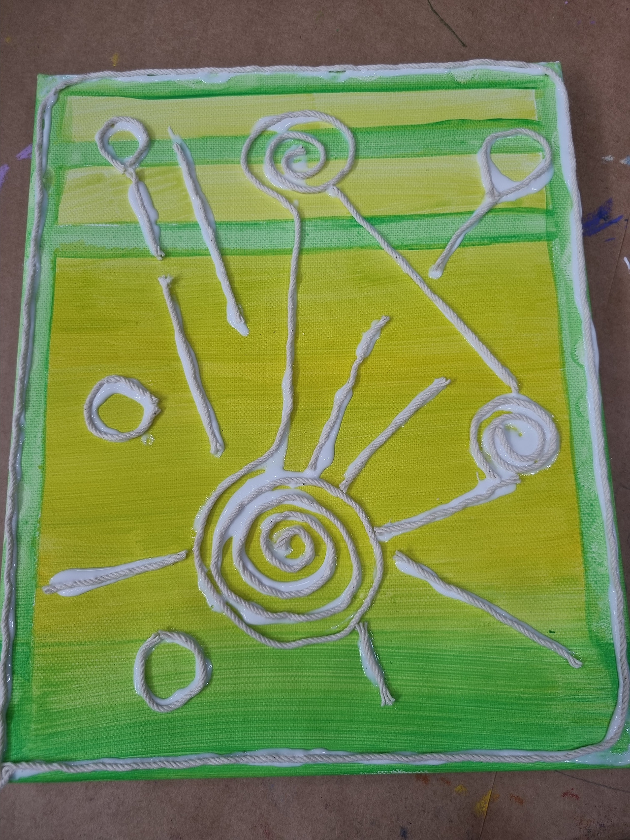 마지막 활동으로 '상징으로 말하는 나'를 하였다. 주어진 캔버스에 원하는 색으로 바탕을 만들고 실을 이용해 '관계'를 표현하였다. 실로 어떻게 인간관계를 표현할 수 있을까? 지금 내가 느끼는 감정을 솔직하게 표현하고 싶었다. 기분이 다운되어 있어 좀 밝은 에너지를 갖고자 연두색과 노란색으로 바탕을 만들었다. 내 인생의 중심은 단연코 '나 자신'이므로 실을 이용해 나를 해처럼 둥글게 표현하였다. 여기에서 나오는 수많은 인간관계들은 가족, 동료, 친구, 지인 등이 될 수 있다. 중간중간 끊어진 실은 예전에는 함께 하였으나 지금은 인연의 끈이 끊어진 시절인연을 표현하였고 앞으로 내가 맺게 될 관계들도 둥글게 표현하였다.