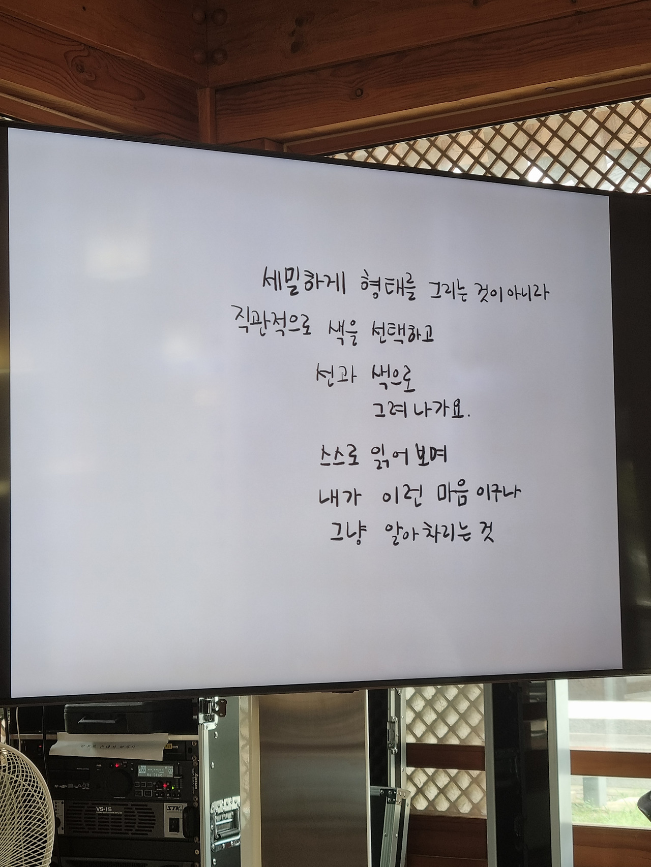 연수생들이 한 명씩 나와 작품에 담긴 이야기를 설명하는데 저마다 자신의 이야기가 다 녹아있어 집중할 수 있었다. 인생은 정말 쉽지 않고, 모든 사람들이 힘들고 괴로운 것은 다 가지고 있구나. 그럼에도 불구하고 주어진 것에 감사하고 소중하게 인생을 생각하여 남과 비교하지 않고 나의 내면에 집중하는 것이 제일 중요함을 한번 더 상기하였다.
