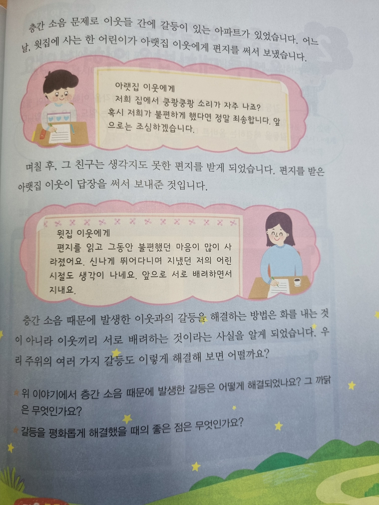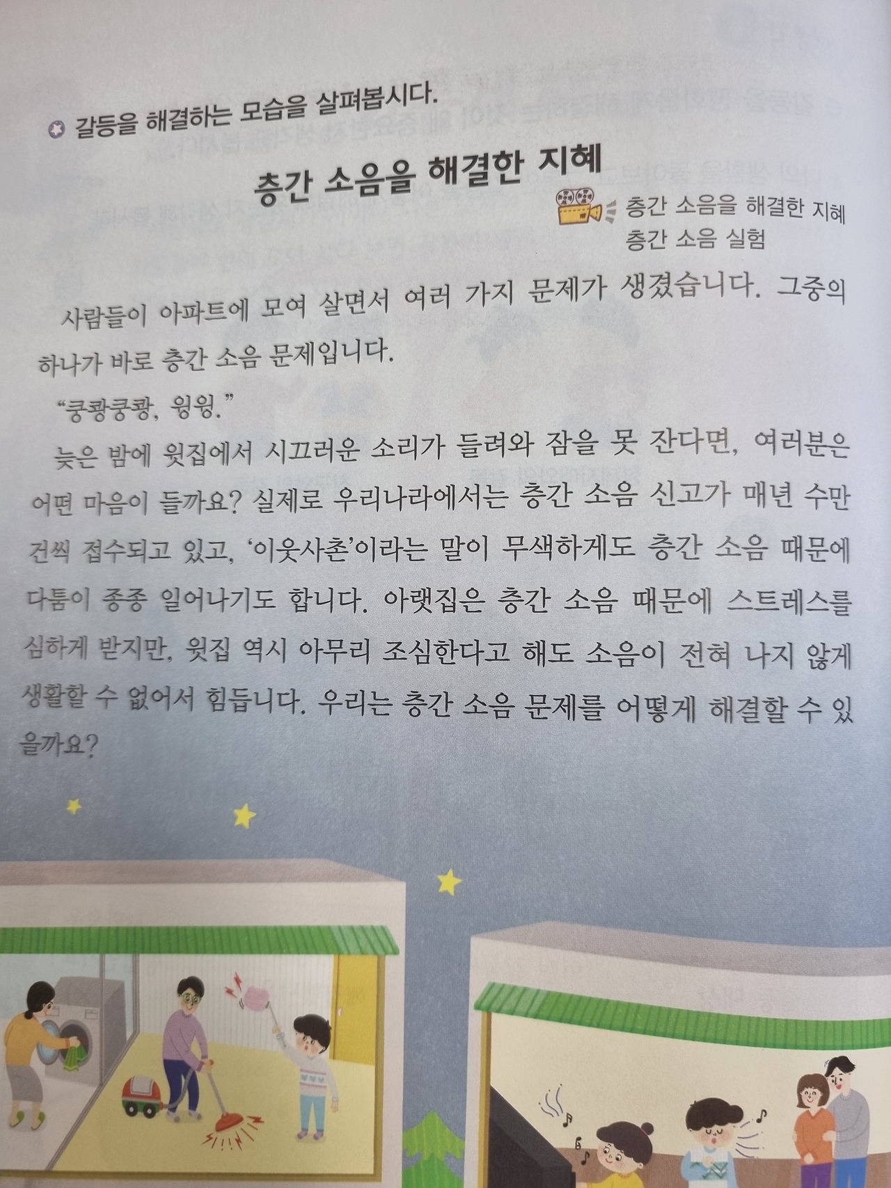 생활 속에서 자연스럽게 생기는 갈등을 평화롭게 해결하는 것이 중요함을 모두 다 알고 있었지만 구체적으로 어떻게 접근해야 하는지 모르는 경우가 많았다. 교과서에는 '층간 소음을 해결한 지혜'라는 제목의 이야기가 있어 이를 읽고 문제를 해결하는 방법을 살펴보았다. 층간 소음으로 이웃 간에 갈등이 생겼고 편지를 주고받으며 이웃끼리 마음을 나눈다는 내용이었다.