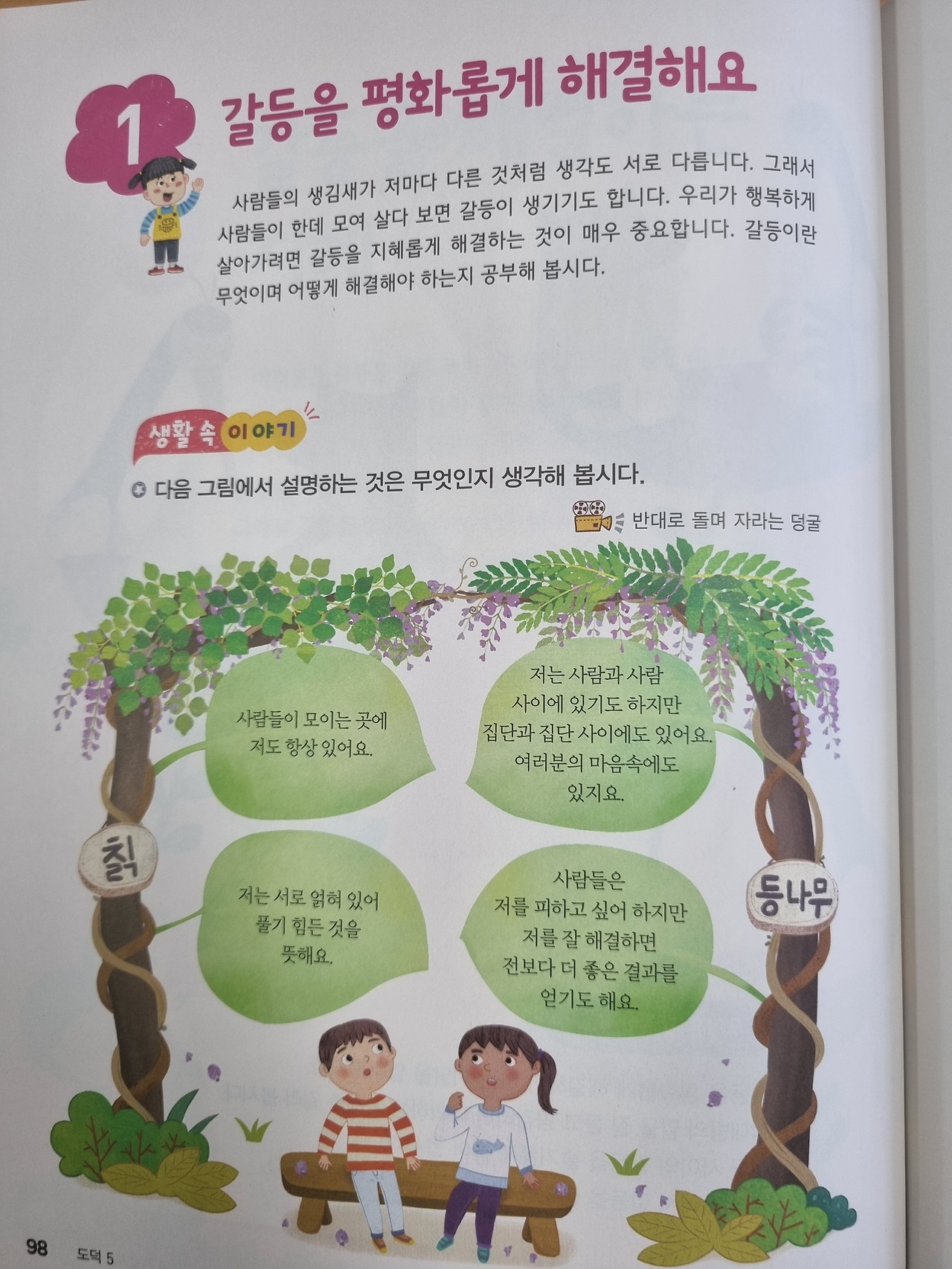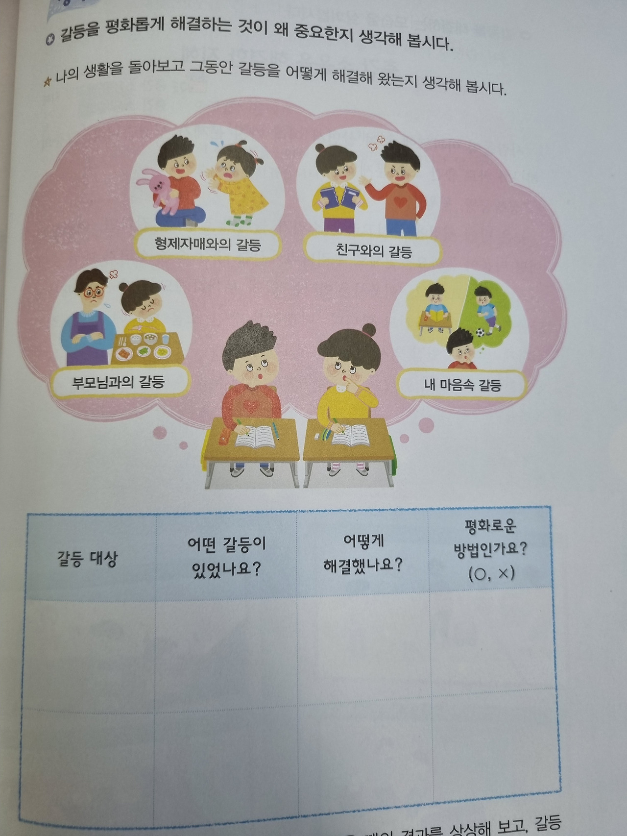 초등학교 5학년 도덕 5단원의 제목은 '갈등을 해결하는 지혜'이다. '타인과의 관계'영역의 '서로 생각이 다를 때 어떻게 해야 할까?(공감, 존중)'라는 주제를 다룬다. 첫 번째 차시명은 '갈등을 평화롭게 해결해요'로서 갈등이란 무엇이고 갈등을 해결하는 다양한 방법 중 평화롭게 해결하는 방법이 바람직함을 여러 사례를 통해 살펴보았다.