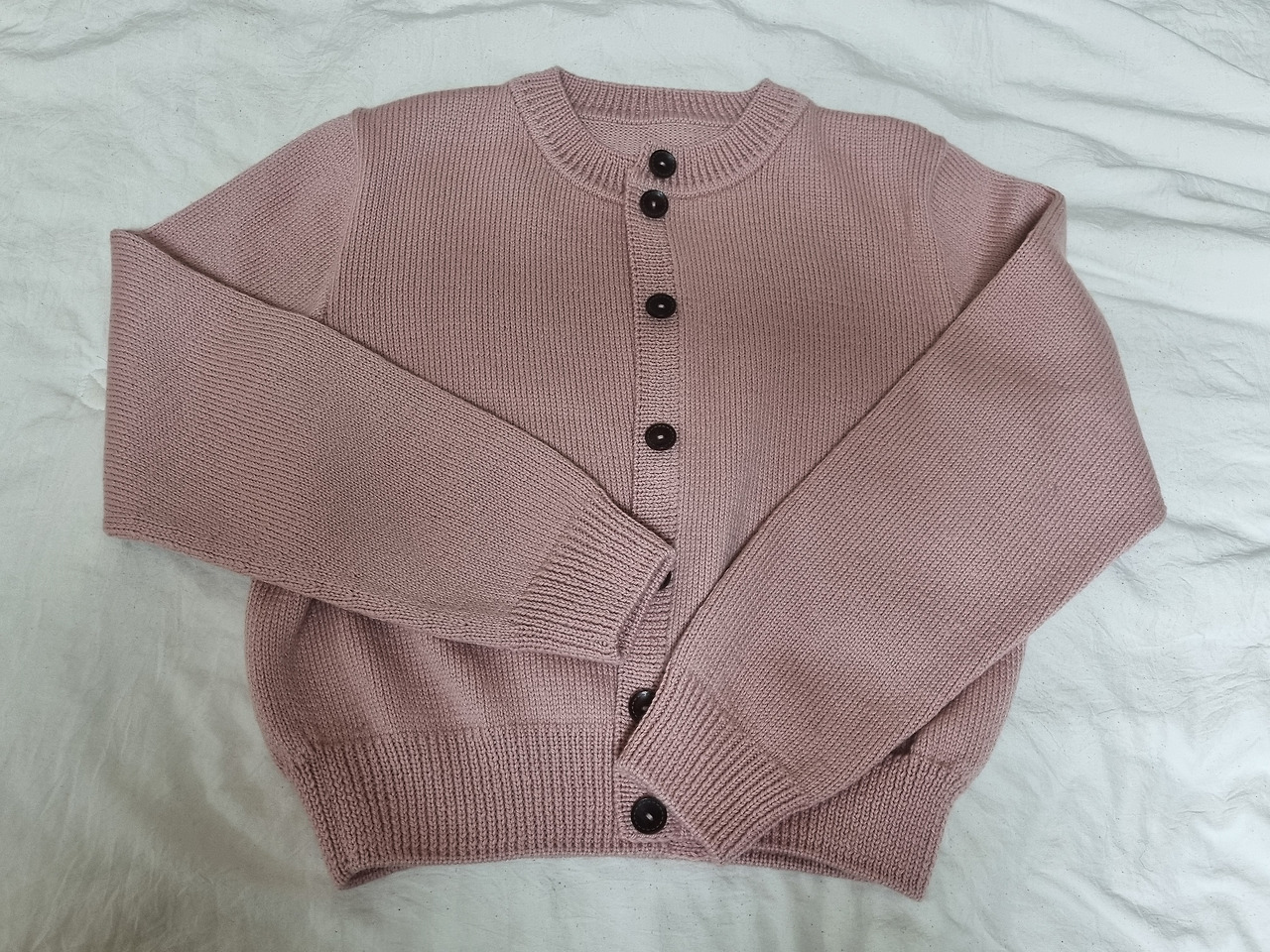 며칠 후 나의 첫 카디건 작품이 완성되었다. 뒤판, 앞판, 소매를 떠서 선생님께 드리면 이어서 옷으로 만들어 주신다. 잇는 작업까지 내가 혼자 하고 싶었지만 이건 앞으로 차근차근 배우리라 다짐해 본다. 우리 뜨개방의 거래처인 세탁소에서 드라이까지 하고 나면 산 옷처럼 자클(물기나 기름기, 윤기 따위가 많이 흘러서 반지르르하다 - 네이버사전)해진다.