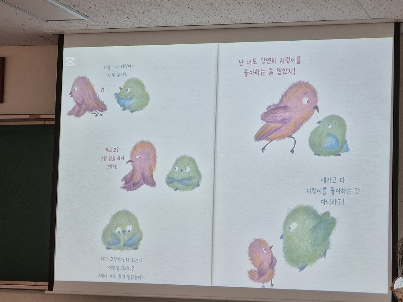 소규모여서 그런지 자연스러운 상황에서 이야기가 잘 나왔다. 같은 책을 보고 토론 주제가 다 다르게 나와서 재밌었다. 토론 한 바퀴가 끝나면 종이에 우리 교실 친구들 전체의 의견이 모아지는데 이를 잘 보이는 곳에 전시 하여 공유를 하는 것도 좋은 아이디어였다.