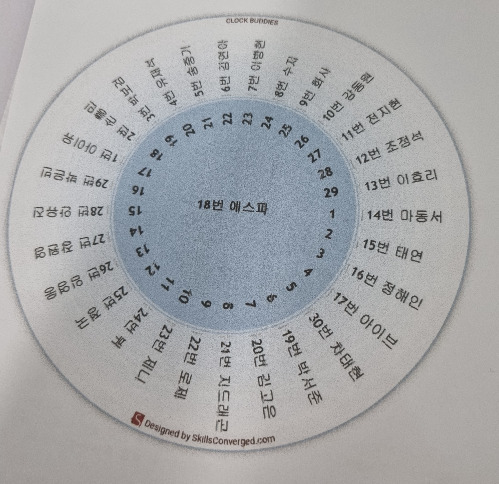 강사님은 현재 4학년 학생들을 가르치고 있는데 4학년 치고는 발표를 너무 안 한다고 하였다. 발표를 하는 학생들만 열심히 하여 안 하는 친구들이 수업시간에 말문을 트이게 하는 방법으로 '시계짝과 질문 주고받기'를 활용한다고 하였다. 'clock buddies' 프로그램을 이용하여 학생들의 이름을 입력하면 자동으로 시계모양 이름이 생성된다. 시계짝이 만들어지는데 "몇 시에 모이세요!"라는 말을 하면 매번 다른 짝을 만나서 이야기를 나눌 수 있다. 한 면에 인쇄를 2매씩 하고, 70%로 줄여서 코팅하면 1년 내내 사용할 수 있어 월요일에 학교에 가서 바로 우리 교실에 적용하고 싶어졌다. 평소 발표를 잘 안 하는 학생들의 말문을 열 수 있는 참 좋은 아이디어였다. 시계 시각은 우리 반에 있는 숫자가 쓰여있는 돌림판을 활용하면 아이들이 더 흥미진진하게 참여할 수 있을 것 같다. 역시 주말나들이를 포기하고 연수에 오길 정말 잘했다.