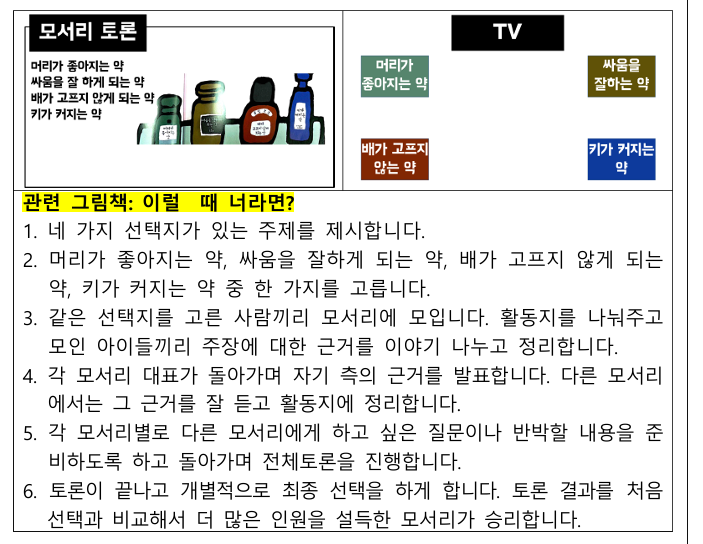 토론이라고 해서 그 결과가 찬성과 반대로만 나오지 않아도 된다는 것도 배울 수 있는 방법을 살펴보았다. 관련 그림책으로 '이럴 때 너라면?'을 읽고 4가지 선택지가 있는 주제를 확인한다. 같은 선택지를 고른 사람들끼리 해당구역에 모여 주장에 대한 근거를 나누고 정리한다. 각 모서리 대표가 자기 측의 근거를 발표하면 다른 모서리 사람들은 그 근거를 잘 들어야 한다. 반박할 내용을 준비하기 위해서다. 토론이 끝나고 개별적으로 다시 선택을 하게 하는데 변화가 제일 많은 모서리가 승리하는 기법이다. 교과서에는 학급 문제나 사회 문제에 대해 토론하는 장면이 많이 나오므로 모서리 토론을 하기 위해서는 이에 알맞은 주제를 정하는 것이 중요하다.