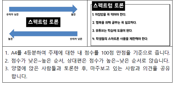 제일 인상 깊었던 토론은 스펙트럼 토론이다. 전체 학생에게 1번이나 2번의 번호를 부여해 준다. 영어교담을 할 때 많이 했던 방법으로 짝을 만들어 게임을 할 때 유용하다. 이번 실습은 '유튜브는 학습에 도움이 된다'는 주제로 자신이 생각하는 점수를 매기는 것으로 시작됐다. 1번 줄 라인은 높은 점수부터 낮은 점수로 한 줄 서기를 하고, 2번 줄 라인은 낮은 점수부터 높은 점수로 한 줄 서기를 하여 1번줄과 2번줄이 마주보게 선다. 먼저, 각 자의 줄에서 자신과 비슷한 점수를 가진 양 옆의 사람들과 주제에 대해 토론을 한다. 그다음 마주 보고 있는 다른 줄의 사람 즉, 점수가 완전히 반대인 사람들과 열렬한 논쟁을 하기 시작한다. 교실 의자에서 일어나 한 줄 서기로 토론을 한다는 것 자체가 재밌었다. 생각보다 나와 비슷한 의견이나 아주 반대인 의견을 가진 사람들 양쪽 모두 이야기가 다 흥미로웠다는 게 신기했다. 의견을 공유한 후 생각이 바뀐 경우도 있어 좋은 경험이 되었다.