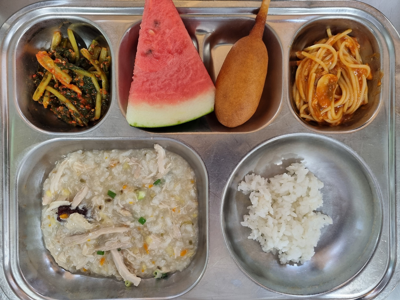 오늘도 역시 급식을 야무지게 받아와 맛있게 잘 먹는다. 오늘의 메뉴는 닭죽, 스파게티, 미니핫도그, 열무김치, 수박, 쌀밥(자율)이다. 맛있는 거 옆에 맛있는 게 있다. 자리에 앉은 준혁이는 닭죽을 먹으며 '맛있다'라는 감탄을 아끼지 않는다. 닭죽 위에 잘 익은 열무김치를 올려 입 안 가득 건강을 채우고, 연신 맛있다고 그러더니 금세 닭죽과 스파게티를 클리어한다. 그리고 한번 더 급식판에 닭죽을 가득 받아오며 한마디를 한다.