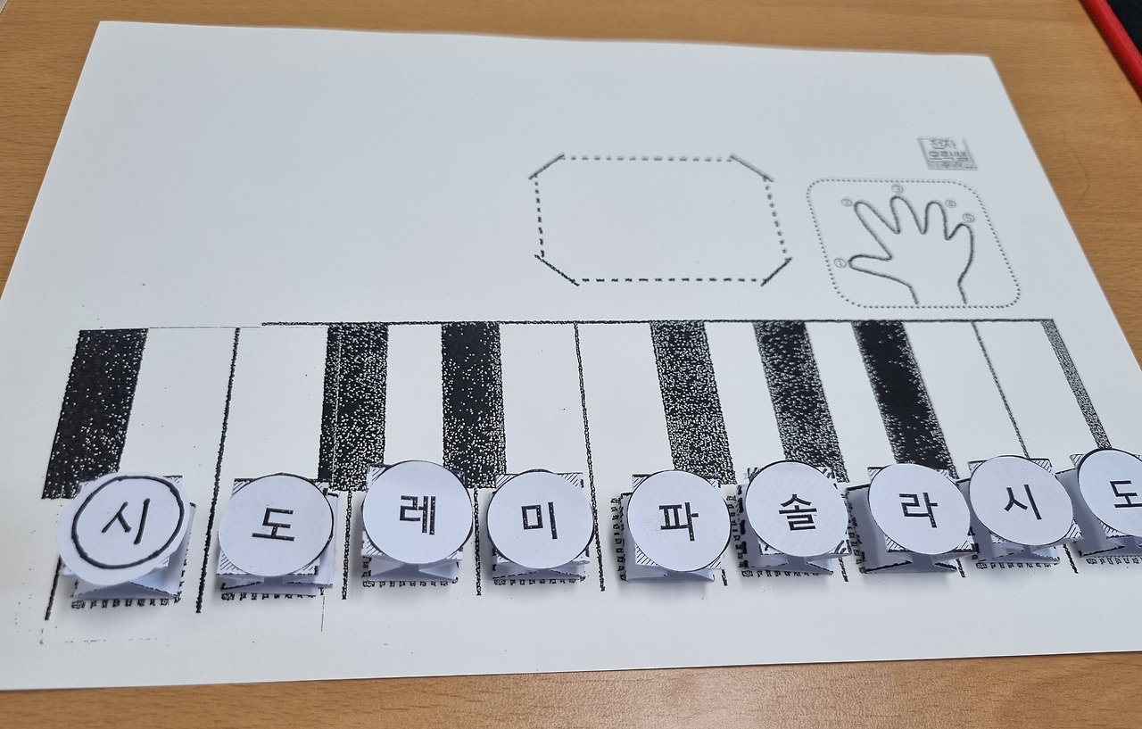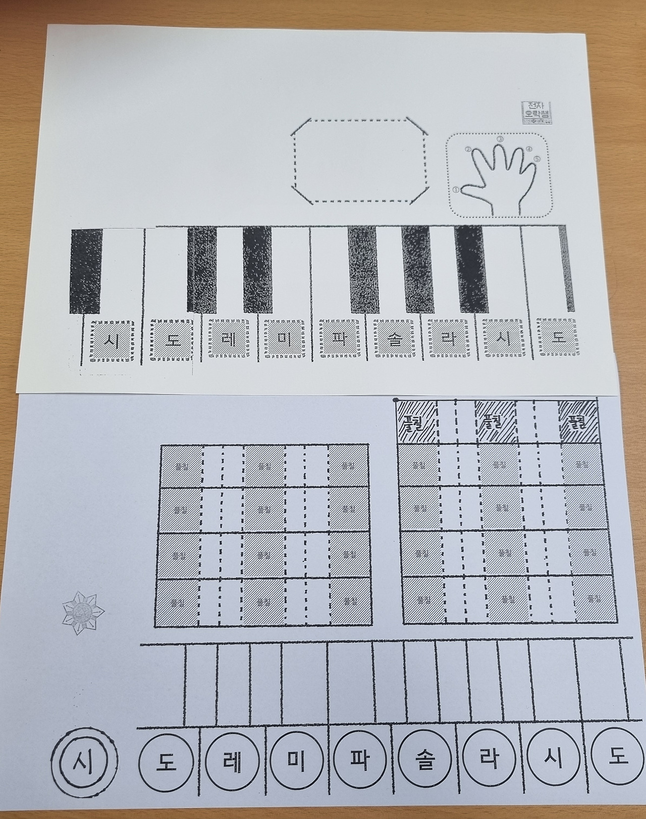 출력한 건반을 살펴보고 복사를 위해 연구실에 가는 도중 옆반 선생님을 만났다. 내 손에 있는 종이건반을 보고 같이 복사를 하러 연구실 문을 열었다. 종이건반이 아이들 손에 비해 많이 큰 것 같아 80% 비율로 복사를 하니 크기가 딱 좋았다. 교과서에는 '낮은 시'가 나오지만 종이건반에는 없어서 어떻게 하나 고민을 하였다. '시' 건반을 하나 더 붙이자는 옆반 선생님의 좋은 아이디어 덕분에 '시' 건반을 붙이는 작업을 하는 동안 옆반 선생님이 그 사이 풀칠을 해야 할 도안을 하나 더 그렸다. 손발이 척척 맞는 기분이었다. 혼자서 했다면 이런 생각을 하지 못했을 텐데 작은 일에도 집단지성이 중요함을 또다시 느낀다. 단순하게 피아노 건반의 모양과 계이름만 쓰여있는 종이를 나누어줘도 되었지만 조금이나마 우리 친구들이 멜로디언을 치는 느낌을 갖게 하기 위해 실제건반처럼 누를 수 있도록 입체감을 더 주었다. '전자오락샘'이라는 닉네임을 가진 선생님께서 올려주신 '나만의 피아노 만들기' 영상을 보며 차근차근 만들어 보니 아이들이 좋아할 것 같아 내일 음악 시간이 기대가 된다. 아이들이 색칠까지 하면 알록달록 보기가 좋을 것 같아 기분이 좋았다.