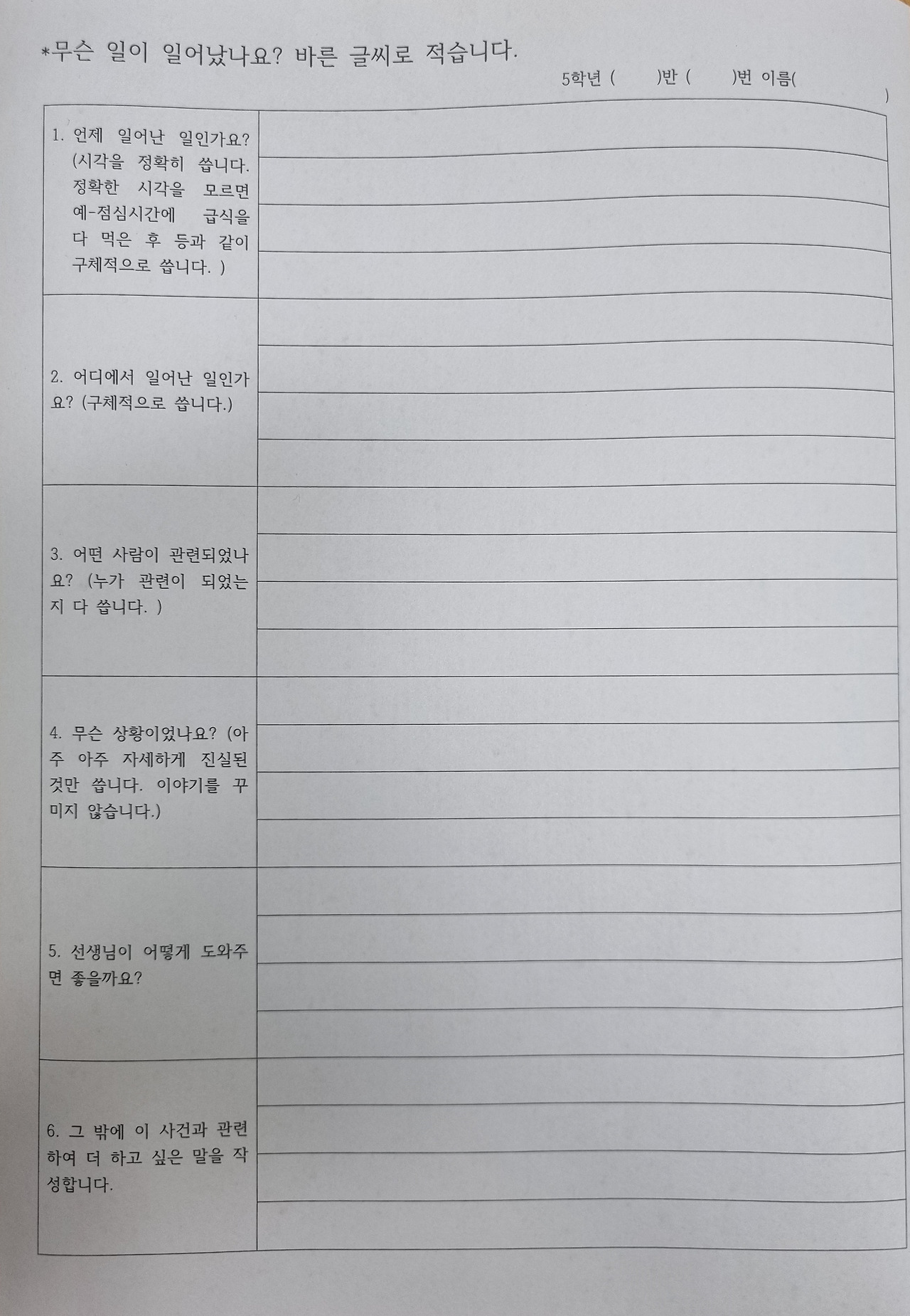 교실에서는 하루에도 수없이 크고 작은 갈등 상황이 발생한다. 사이가 좋더라도, 장난으로 시작했더라도 기분이 상하면 바로 담임교사에게 와서 친구의 행위를 말한다. 그럼 관련자들을 모두 따로 불러 양쪽 말을 다 들어봐야 한다. 가벼운 사안이라면 서로 사과를 하고 마무리를 하면 되지만 무거운 사안으로 진행될 것 같으면 상황을 정확히 판단하기 위한 '무슨 일이 일어났나요?'를 쓰게 한 후 잘 읽어보고 판단을 한다. 대부분 어느 한쪽만의 절대적인 피해자, 가해자의 상황은 없다. 하지만 내가 직접 보지 않았고 진술과 증언에 의존을 하다 보니 판단을 잘해야 하는데 에너지 소비가 상당하다. 해가 갈수록 하지 마라는 것은 늘어나는 데 지도하기가 가끔은 벅차다. 수업만 평화롭게 하고 싶은 게 이루어질 수 없는 꿈이다. 생활지도가 경력이 쌓일수록 어려운 건 절대 기분 탓이 아니다.