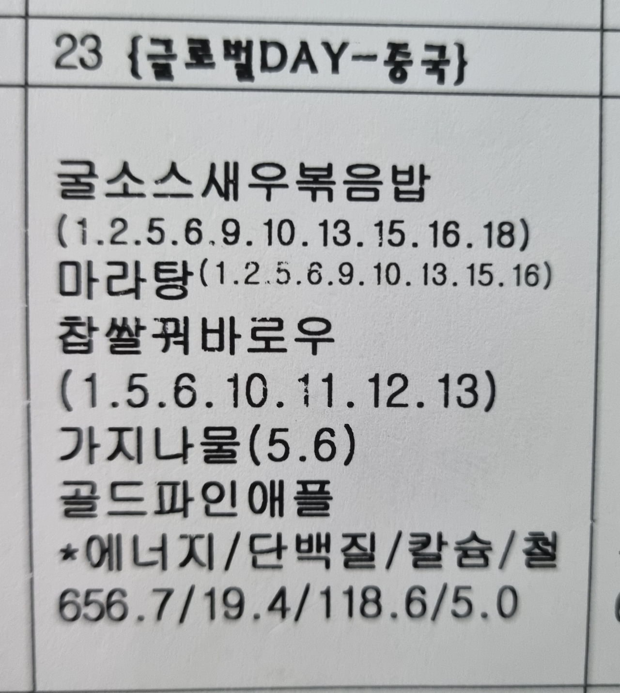 우리 학교에는 한 달에 한번 '글로벌 데이'가 있다. 이번달 글로벌 데이는 중국이 주제다. 그동안 일본, 베트남, 태국 등 다양한 글로벌 데이를 즐길 수 있었다. 유독 인기가 있는 마라탕은 나도 매우 좋아하는 메뉴이다. 매콤하고 고소하여 여간 맛있는 게 아니다. 급식을 받아보니 마라탕에 갖은 채소와 비엔나소시지를 비롯하여 넓적 당면, 옥수수면, 얇은 두부면까지 들어있어 아주 제대로 맛을 내었다. 사 먹는 것보다는 덜 자극적이었지만 정말 맛있었다. 꿔바로우는 조금 식었지만 달콤한 소스에 버무려져서 입안 가득 행복을 느낄 수 있었다. 아이들은 연신 너무 맛있다고 감탄하며 입에 묻혀가면서 맛있게 마라탕을 먹는다.