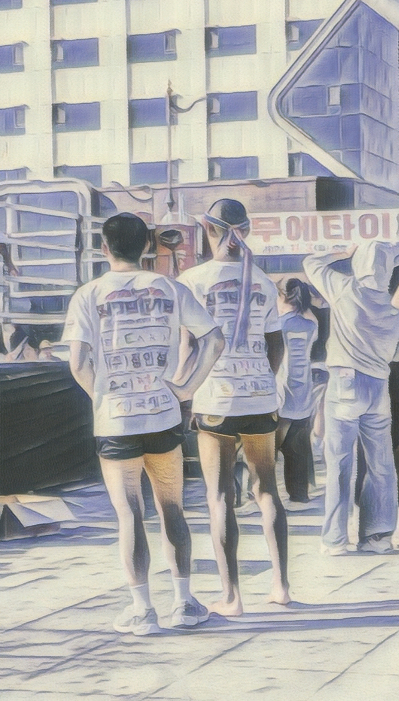 수련시간에 내가 아줌마라고 해서 절대 봐주지 않는 무시무시한 악마의 조교 같은 교범님의 경기만 볼 수 있었다. 1시에 경기가 시작된다고 해서 맞춰서 갔으나 각종 의식 및 내빈 소개, 인사말 등으로 진짜 경기는 2시 정도에 시작된 것 같다. 11월이었지만 7,8월 같은 더위에 관람객과 선수들은 지쳐가는 듯하였다. 멀리서 경기를 준비하는 우리 체육관 식구들이 보여 조심스레 다가가 인사를 하였다. 그동안 체중감량을 힘들게 했을 선수가 너무 안쓰러웠고 끝까지 호흡을 잃지 않으려 연습을 하는 모습이 정말 멋져 보였다.