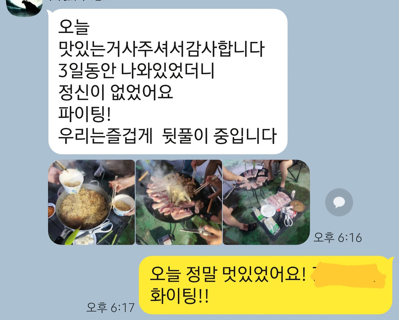 그날 저녁 집에 돌아와 쉬는데 관장님으로부터 톡이 와있었다. 한창 체육관 옥상에서 라면과 삼겹살 파티를 하는 사진과 함께 응원 와줘서 고마웠다는 인사였다. 그동안 선수들에게 계체량을 위한 체중 감량이 얼마나 힘들었지 나는 상상조차 할 수 없기에 이 시간을 후회 없이 즐기길 바랐는데 역시 젊고 어린 학생들이라 회복탄력성이 매우 좋은 것 같았다.