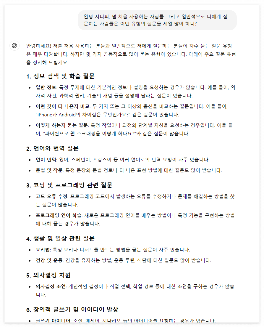 챗gtp에게 일반적으로 질문한다고 하면 무엇을 질문하고 싶을까? 나는 다른 사람들은 어떤지 잘 모르겠다.