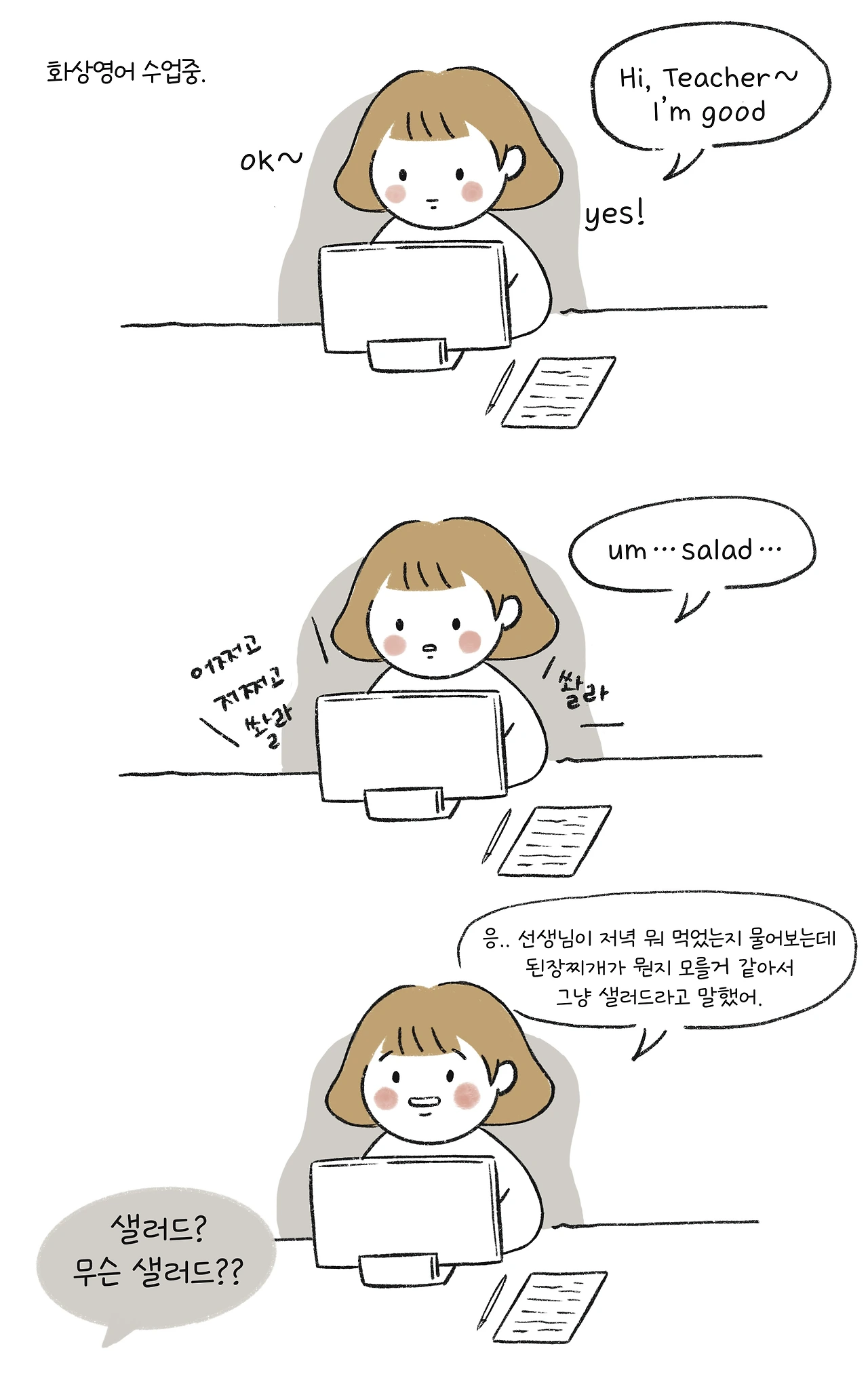 내가 너무 의아해서 아이에게 물었더니 “된장찌개라고 말하면 선생님이 뭔지 몰라서 계속 sorry? 하고 물을 거 같아서 샐러드라고 대답했어. “